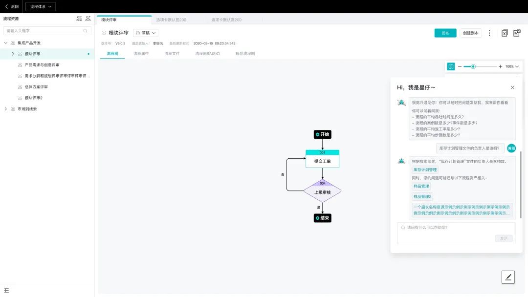 通过与AI对话,用户可以快速查询与流程、资源相关的任何内容,并获得基于上下文的智能推荐,极大提升了流程管理的效率和智能性。