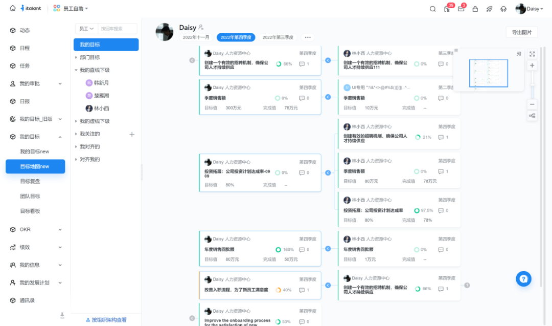 九州通集团在完成战略解码的基础上,进一步将宏观战略层层拆解为各组织具体的行动指南。紧接着,集团依据各组织的职能定位与工作要求,逐一厘清了每个岗位所需肩负的目标责任,实现责任到人。在这一过程中,九州通借助北森绩效云,成功实现了组织目标与二级部门目标之间的无缝对接,并逐一细化到员工个人,构建了一幅直观且详尽的组织目标地图。这不仅让管理层能够一目了然地查阅团队目标及核心要点,确保各层级目标紧密相连,形成强大的协同效应,并利用目标地图对各业务目标的推进情况进行实时追踪。同时,也让不同组织的员工能够清晰地认识到自己的工作导向,从而以更加饱满的热情投入到日常工作中。此外,集团还引入了周报和月度会议机制,定期线上做目标复盘,并在线安排任务,以推动员工能够紧跟进度,顺利达成季度和年度目标。