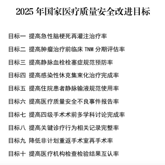 为进一步加强医疗质量安全管理,持续提升医疗质量安全水平,根据《全面提升医疗质量行动计划(2023-2025年)》《关于进一步推进医疗机构检查检验结果互认的指导意见》等文件要求,结合2024年目标改进情况和变化趋势以及年度医疗质量安全监测数据情况,形成了《2025年国家医疗质量安全改进目标》。