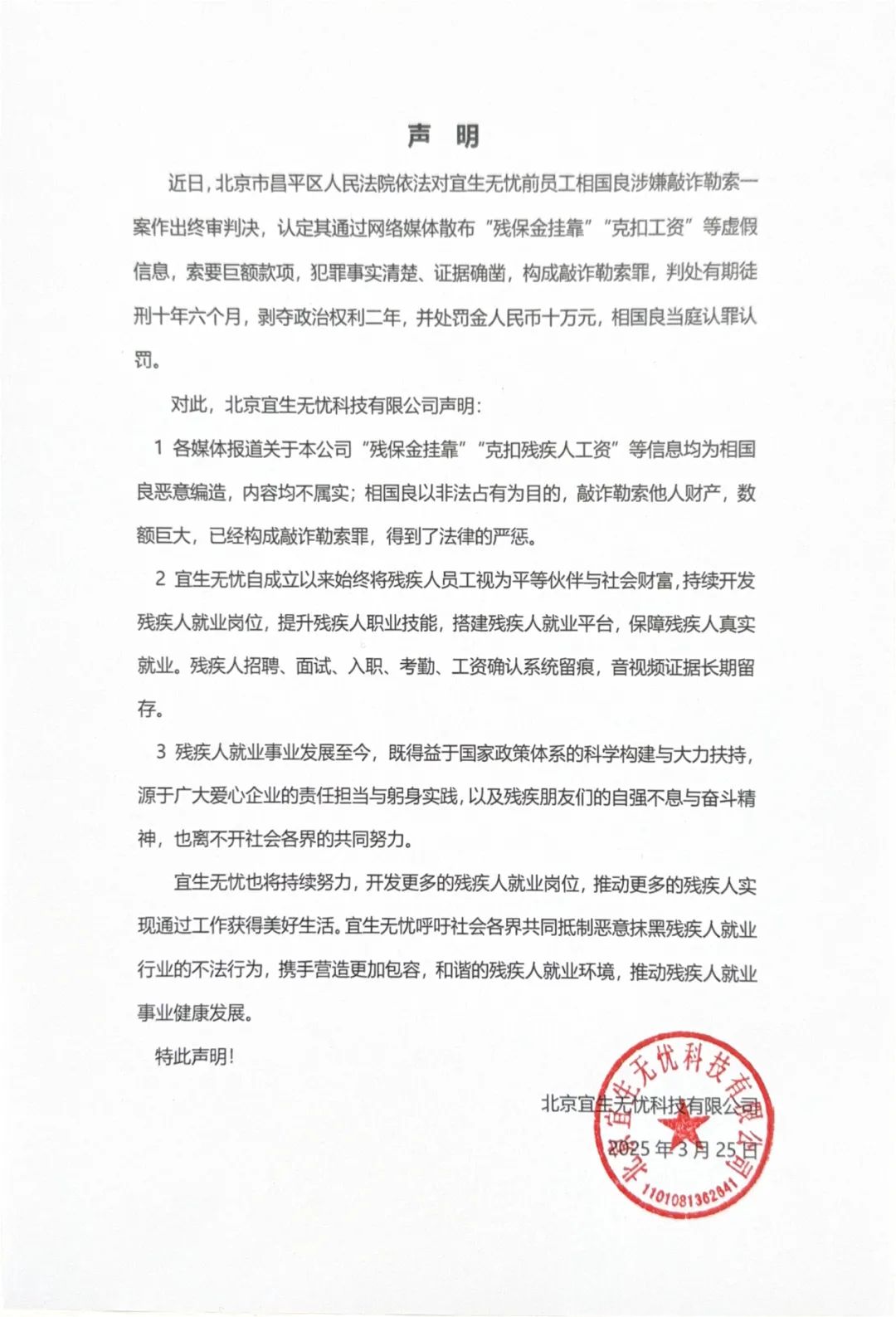 相国良2017年从宜生无忧离职,公司全额支付其应得收益,无离职纠纷。为索取巨额钱财,相国良在离职7年后于2023年10月通过社交媒体、网络论坛传播虚构“残保金挂靠”“克扣残疾人工资”等虚假信息,造成股东撤资,客户终止合作,员工离职等严重后果,对我司造成巨大负面影响,相国良趁机胁迫宜生无忧与其签订所谓“补偿协议”“研发协议”的虚假合同,并以“股权”“期权”“提成”等多种名义索取巨额款项,我司当即选择报警,后相国良被警方依法逮捕归案。法庭上相国良承认各媒体报道关于宜生无忧负面内容均是他提供虚假信息并策划制造舆情,当庭认罪认罚。