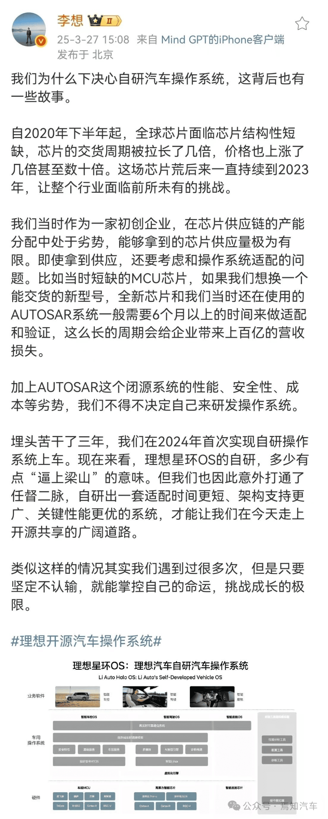 李想对理想星环OS和AUTOSAR的区别进行了讲解,部分原文引述如下: