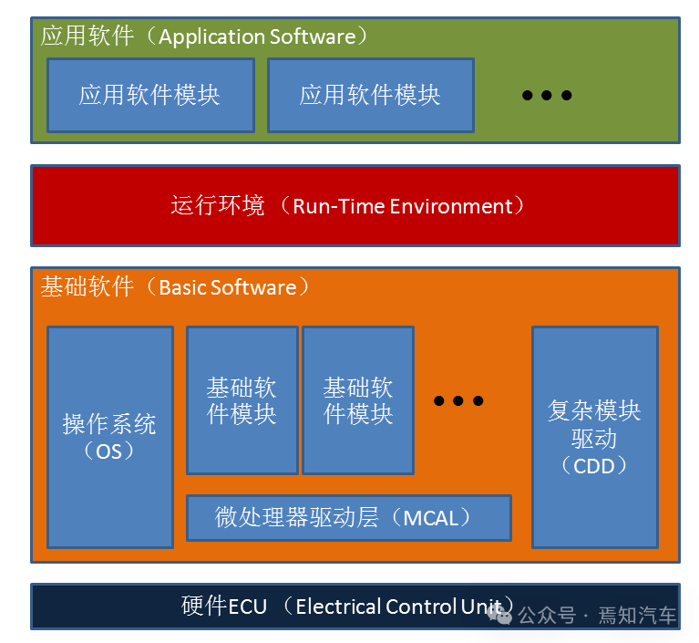 运行时环境(RTE):作为中间件,RTE 负责在应用程序软件组件之间,以及基本软件和应用程序软件组件之间进行 ECU 内部和 ECU 之间的信息交换,也被称为虚拟功能总线(Virtual Function Bus),其作用是控制数据交换,确保软件组件可任意分布在不同设备上,而无需考虑其他运行时系统或不同功能的计算结果 。