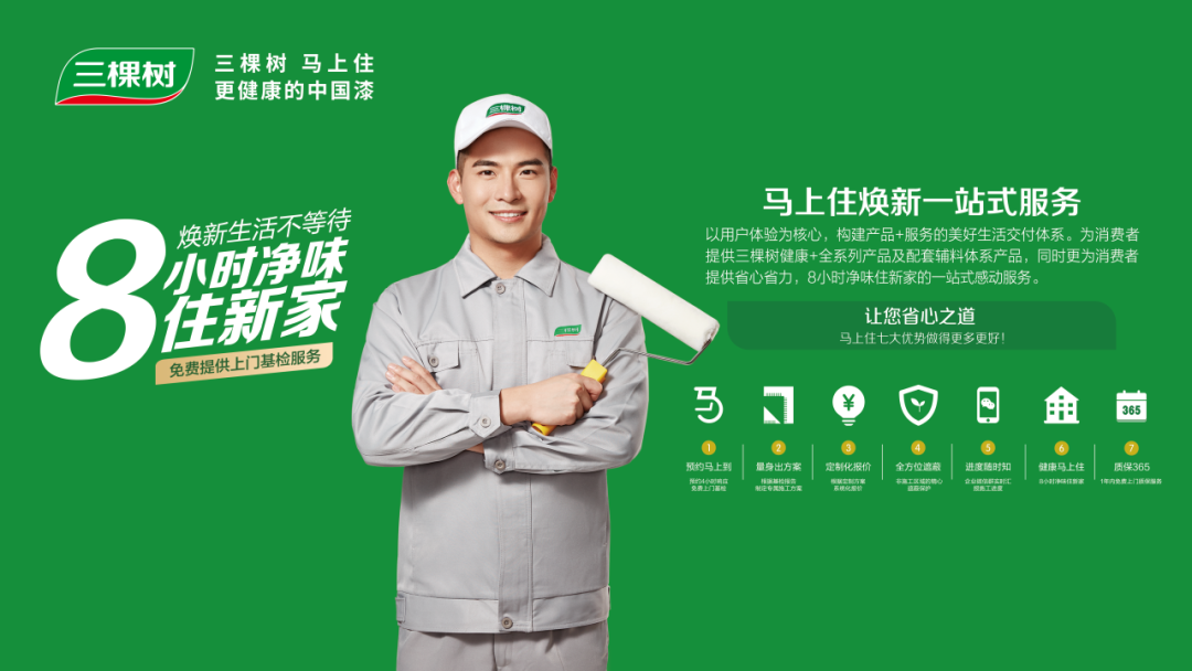 同时,三棵树还积极打造三棵树马上住焕新一站式服务,拥有一支高素质的客户服务团队,4小时响应需求,24小时预约上门,为消费者提供全方位、个性化的服务。无论是线上咨询还是线下购买、再到涂刷服务,都能让消费者享受到便捷、贴心、满意的体验。