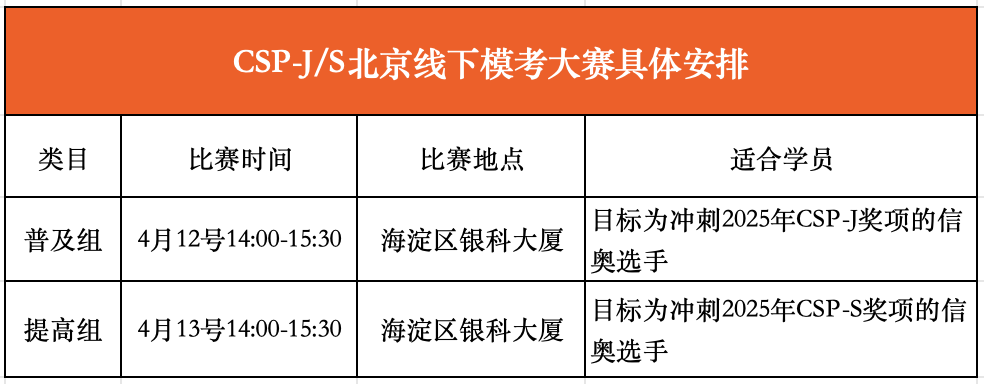 希望各位选手能够在核桃编程CSP-J/S北京线下模考大赛中快速提升竞赛能力,家长们也可以通过模考了解孩子的学习情况,及时调整备考策略。