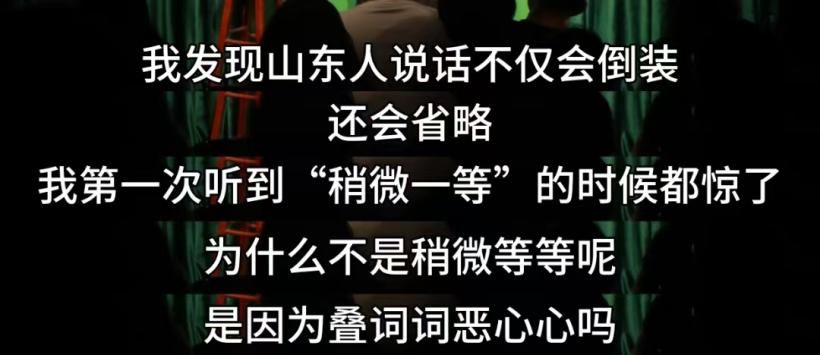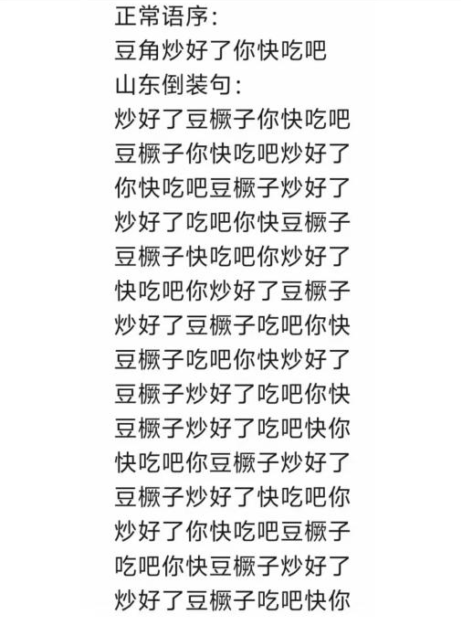有人精辟形容山东倒装“开头逮到什么说什么,中间想起什么说什么,最后差什么补什么”,主打一个嘴在前面说,脑子在后面跟。