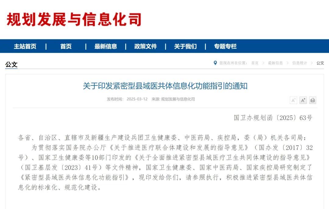 关注丨国家卫生健康委等三部门印发《紧密型县域医共体信息化功能指引》
