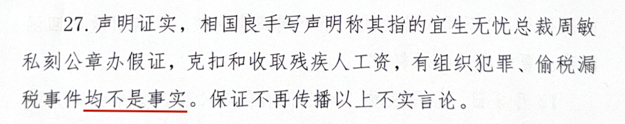 相国良2017年从宜生无忧离职,公司全额支付其应得收益,无离职纠纷。为索取巨额钱财,相国良在离职7年后于2023年10月通过社交媒体、网络论坛传播虚构“残保金挂靠”“克扣残疾人工资”等虚假信息,造成股东撤资,客户终止合作,员工离职等严重后果,对我司造成巨大负面影响,相国良趁机胁迫宜生无忧与其签订所谓“补偿协议”“研发协议”的虚假合同,并以“股权”“期权”“提成”等多种名义索取巨额款项,我司当即选择报警,后相国良被警方依法逮捕归案。法庭上相国良承认各媒体报道关于宜生无忧负面内容均是他提供虚假信息并策划制造舆情,当庭认罪认罚。