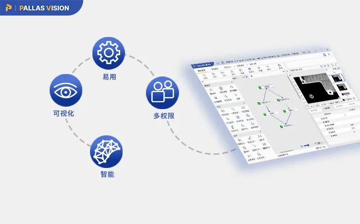 本系统展示了通过大恒图像最新推出的PALLAS VISION视觉软件,实现对多种精密金属件的视觉动态检测。用户无需代码编写,直接通过工具的拖放和组合,在该平台上即可实现完整算法流程的搭建。通过同样方式,自定义终端界面编辑功能来完成整个视觉检测软件的开发。