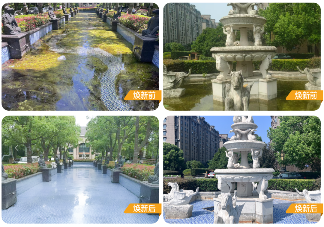 团队进驻后,立即对园区业主归家动线、高频触点区域及卫生死角进行全面深度保洁;重新铺设路面砖块,翻新修缮木质栈桥木板,对小区水系河道实施彻底清扫;同时,对小区路灯、楼道、地库照明进行全面维修,更换灯泡约3000盏,提升安全系数。