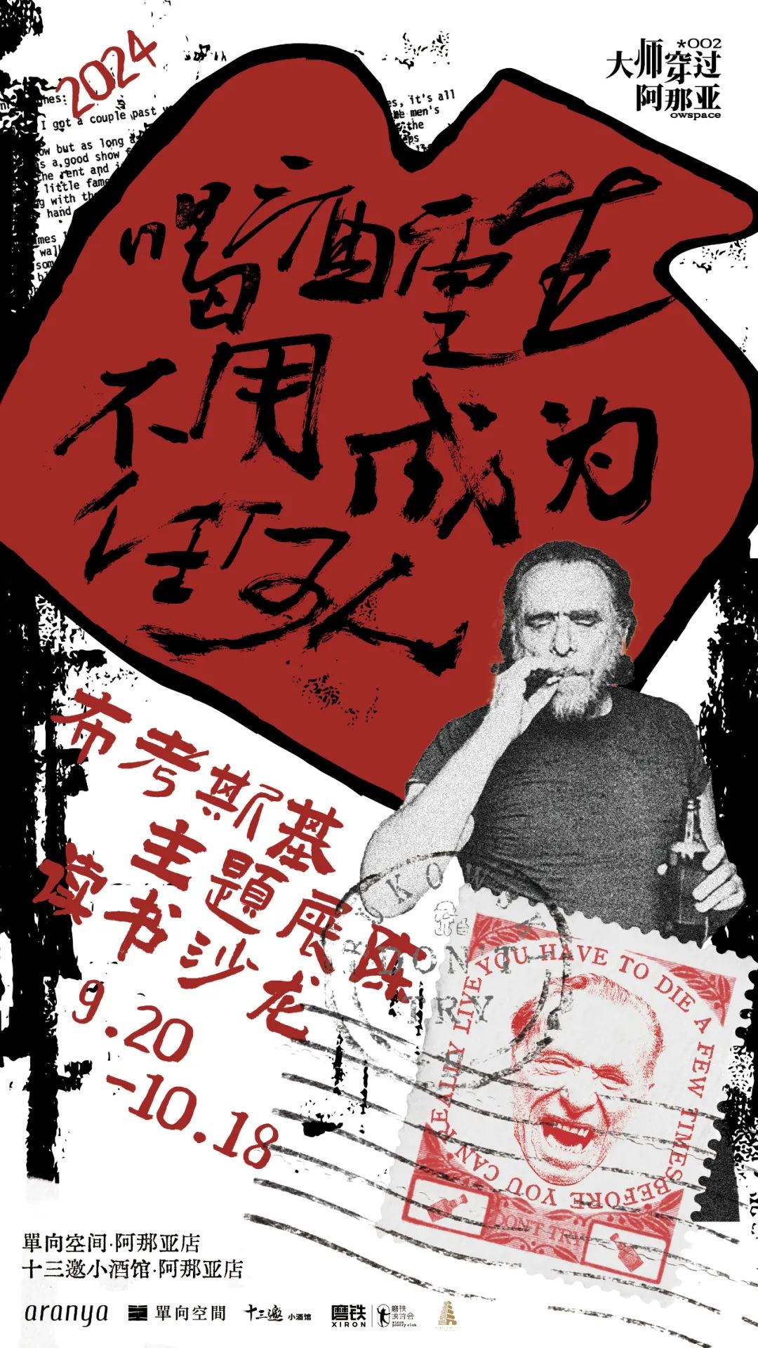 基于磨铁读诗会出版的《这才是布考斯基》《关于写作》《关于猫》《边喝边写》《醉弹钢琴如敲打击乐器直到手指流血》和巴别塔诗典《爱是地狱冥犬》,我们从布考斯基的诗歌、小说、书信、涂鸦、纪录片出发,在阿那亚单向空间和十三邀小酒馆呈现一个展览。