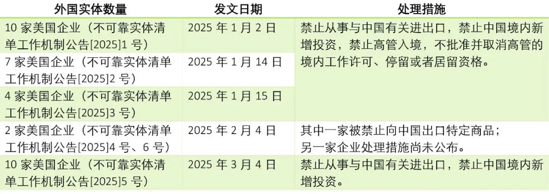 自2023年我国首次将外国实体列入不可靠实体清单以来,截至2025年3月中旬已经累计有38家外国实体被列入清单。其中在2025年被列入清单的外国实体达到了33家(参见下表)。