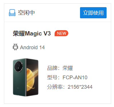 但您无须为购买测试设备占用资金与时间,Testin云测目前已上线荣耀Magic V3真机,为企业和开发者提供包括远程真机调试、新机速测等多项测试服务。我们将依托最新、最全的测试资源、领先的智能测试技术、专业的测试团队给企业带来业界最佳的软件测试服务体验。还等什么,快来试试吧!