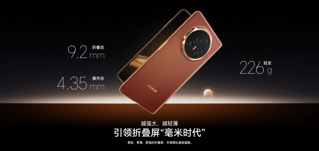 首先,具体设计上,荣耀Magic V3采用新一代荣耀鲁班架构,折叠态的厚度为9.2mm,展开态的厚度为4.35mm,整体机身轻至226g,引领折叠屏“毫米时代”。