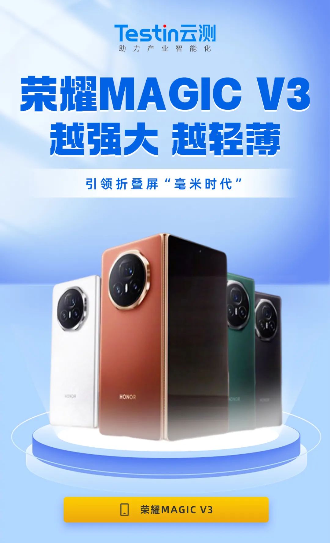 Testin云测始终致力于为用户提供最新、最全面的服务。近日,荣耀Magic V3系列手机正式开售,Testin云测已经第一时间购买并上线至我们的兼容性和真机服务平台,为企业和开发者提供最新的设备和自身软件之间的问题解决方案,引领软件测试行业的新潮流!