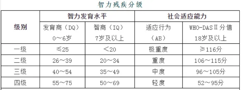 重度――与人交往能力差、生活方面很难达到自理、运动能力发展较差;需要环境提供广泛的支持,大部分生活由他人照料。
