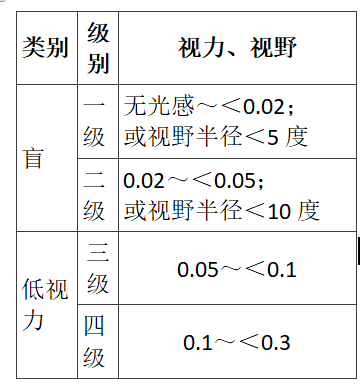 视力残疾分级原则:按视力和视野状态分级,其中盲为视力残疾一级和二级,低视力为视力残疾三级和四级。