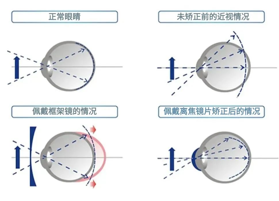 首先需要明确的是:普通的近视眼镜只能矫正视力,帮助孩子看得更加清晰,但并不能有效控制近视度数的增长!而上面提到的特定类型镜片,有一个通用名称——离焦镜片!这类镜片利用近视周边离焦原理进行特殊设计,其主要作用在于延缓儿童青少年近视度数的进一步加深!周边离焦镜片是一种经过特殊设计的多焦点镜片。其原理是通过将投射在视网膜周边的光线焦点前移至视网膜前方,从而形成一种“近视离焦”状态。这种设计不仅确保孩子能够看得清楚,同时长期佩戴还可以有效控制眼轴长度的增长,进而延缓近视度数的加深。