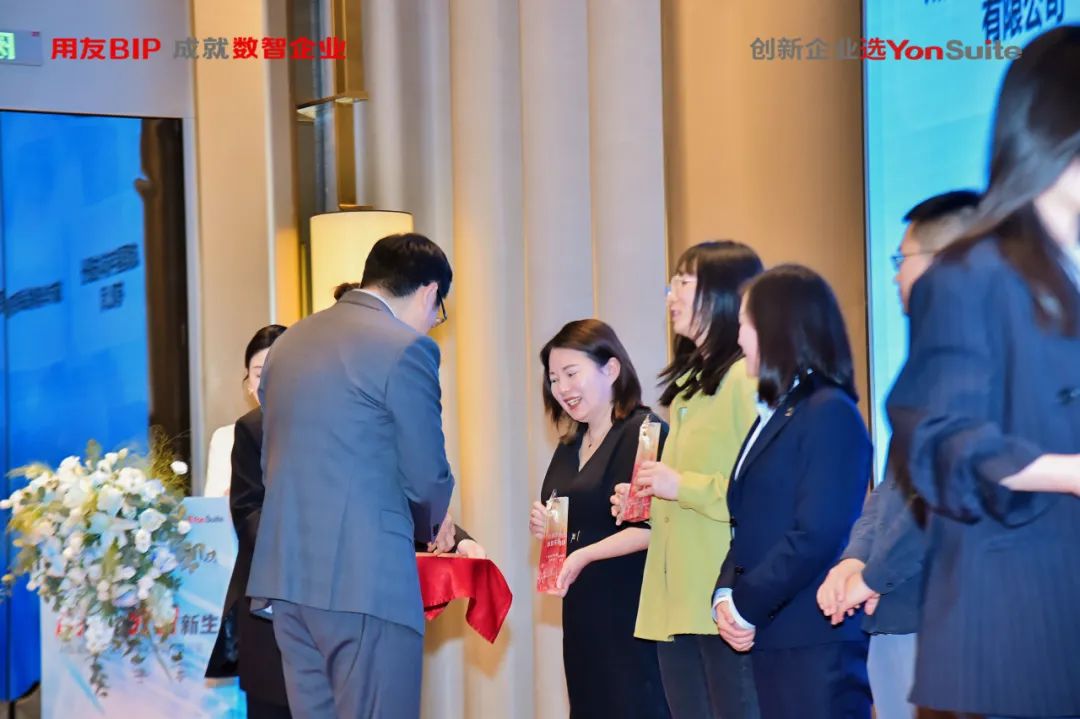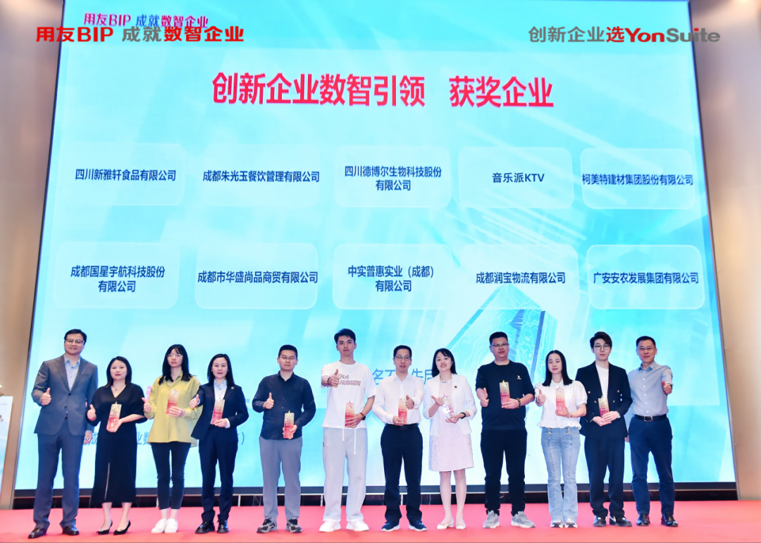 为此,用友YonSuite特别设立【创新企业数智引领奖】,致敬那些将技术从概念变为增长引擎的领航者。与会嘉宾共同见证了四川新雅轩食品有限公司、成都朱光玉餐饮管理有限公司、四川德博尔生物科技股份有限公司、音乐派KTV、柯美特建材集团股份有限公司、成都国星宇航科技股份有限公司、成都市华盛尚品商贸有限公司、中实普惠实业(成都)有限公司、成都润宝物流有限公司、广安安农发展集团有限公司的高光时刻。