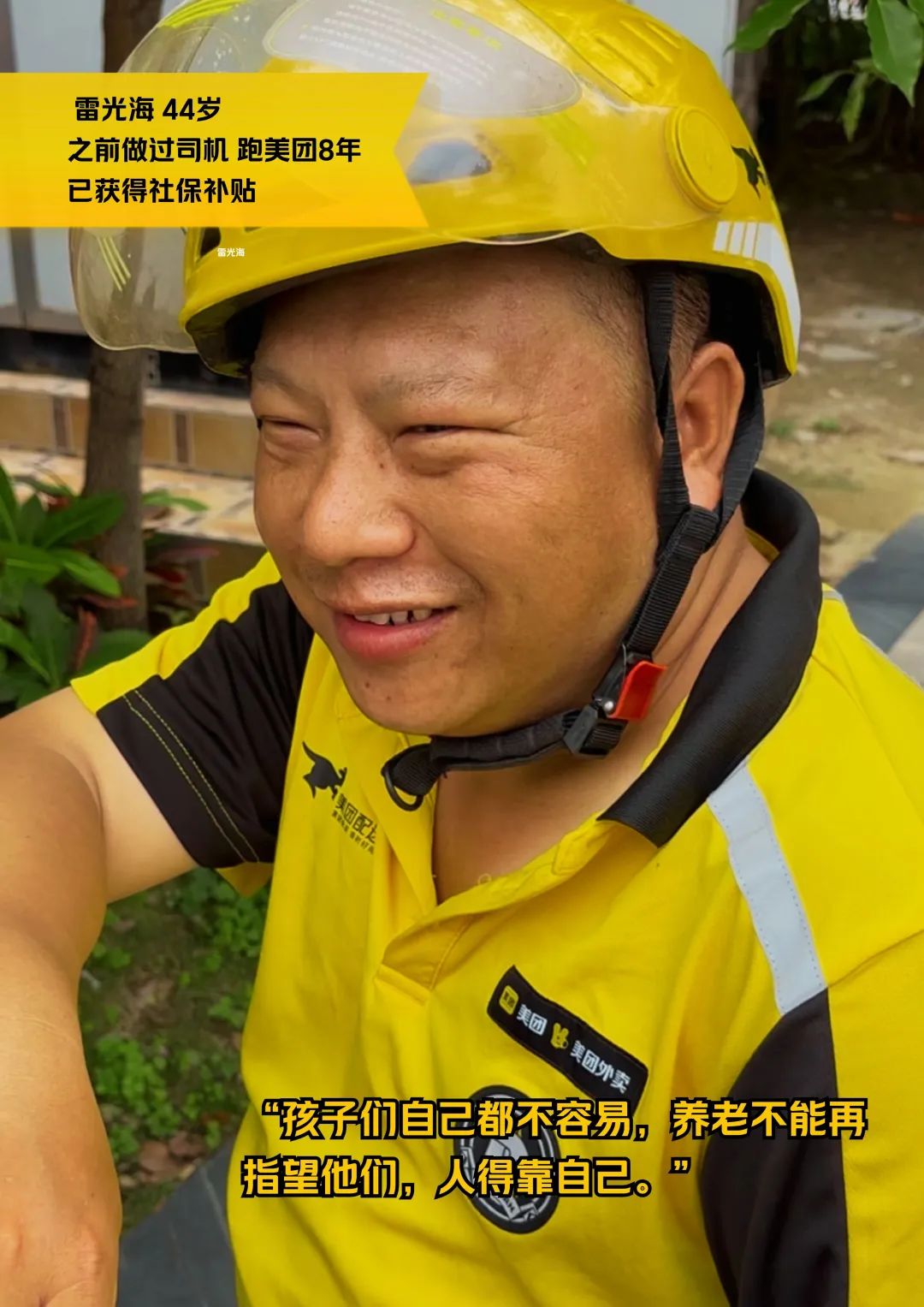 四川人雷光海跑单8年,要养三个孩子,几乎每月都能赚一万多。他说,不打算靠孩子养老,希望通过社保减轻未来孩子们的负担。社保补贴到账那一刻,他把消息发给老婆,晚上准备全家出去吃自助庆祝一下。