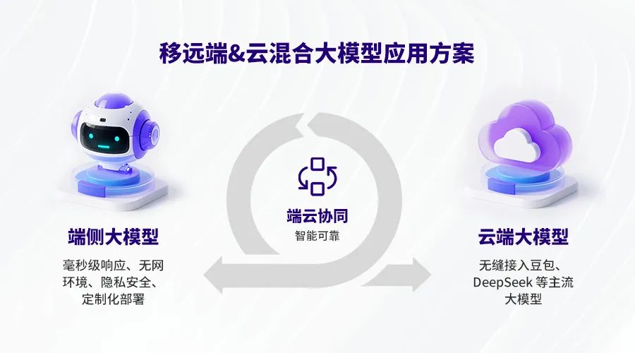 在移远端&云混合大模型机器人大脑解决方案中,围绕移远AI模组及其强大算力,创新性地构建了端侧与云端大模型的深度协同体系,如同给机器人同时装上了“极速本地处理器”与“云端超级知识库”。
