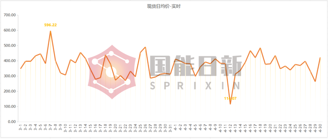 现货市场实时出清均价为368.11元/兆瓦时,最低为114.07元/兆瓦时(4月12日),最高为596.22元/兆瓦时(3月7日);