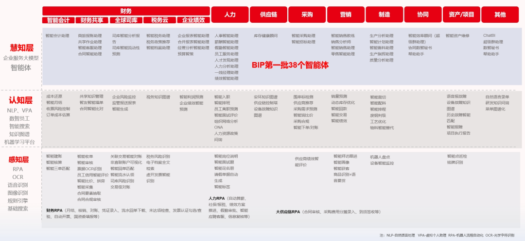 用友BIP融合感知智能、认知智能和慧知智能三个层级上构建全景式的AI赋能能力,提供业务嵌入的场景智能和开箱即用的智能应用。特别是集成国产大模型(如DeepSeek),面向企业运营和业务优化,在财务、人力、供应链、制造领域进行模型精调,发布垂类大模型YonGPT,实现自然语言交互和智能决策辅助。