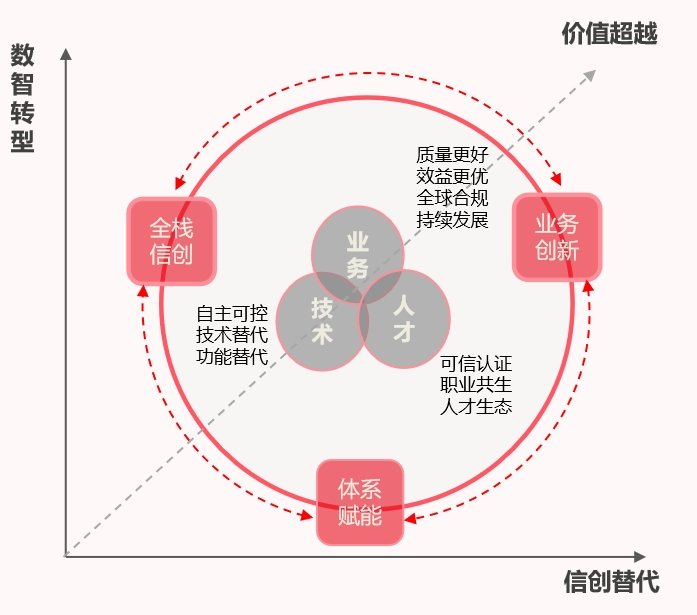 以管理创新为驱动,价值创造为目标,全栈技术为支撑,将信创替代与数智化转型相结合,回归本质,重塑价值,形成新的思维模式、行为模式、商业模式和生产方式、工作方式。