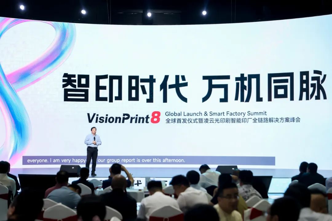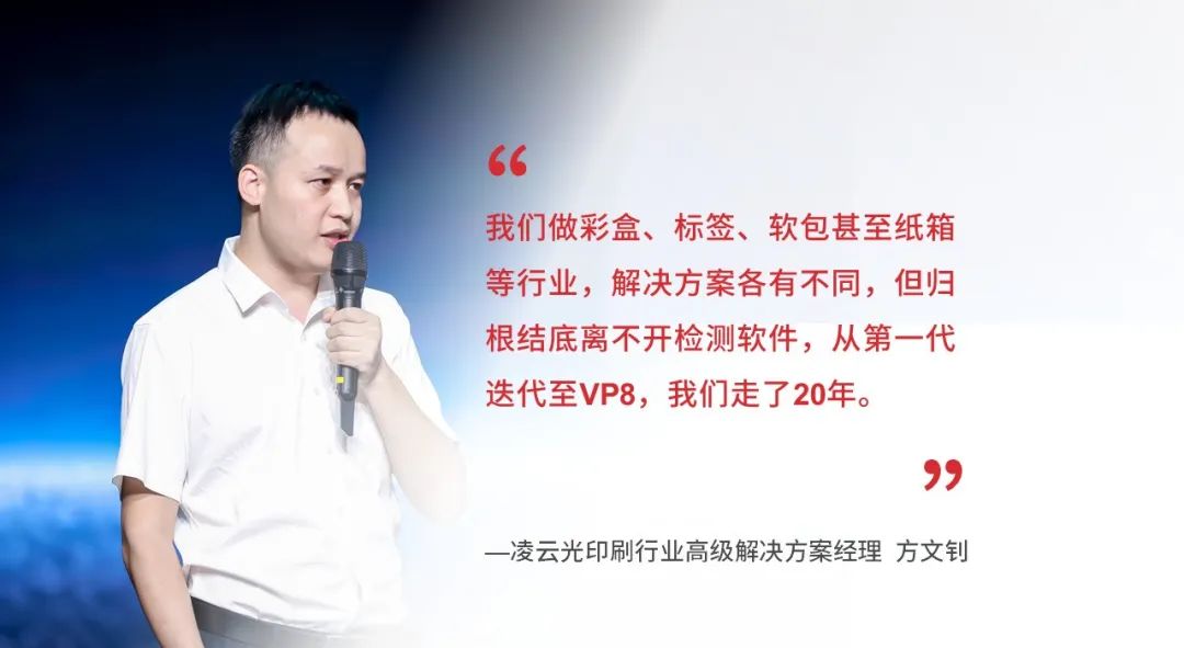 凌云光董事长姚毅博士进行了总结发言,特别提到了利用AI技术提升印刷质量检测的智能化水平,帮助客户更好地管理产品质量,持续提升整体的生产能力和管理水平。