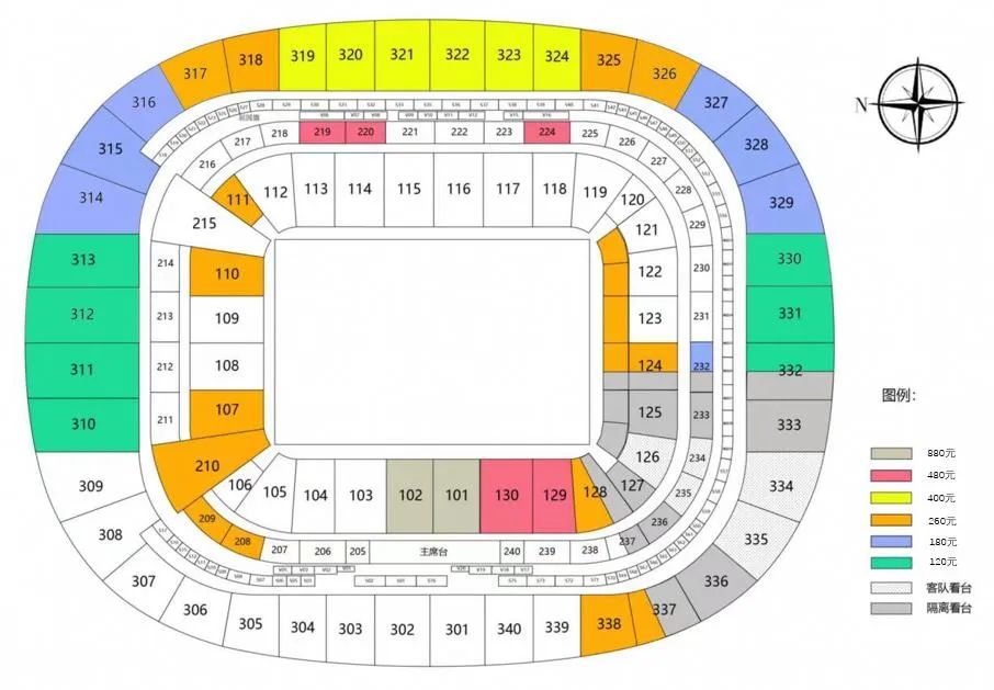 120元档:310区、311区、312区、313区、330区、331区、332区180元档:314区-316区、327-329区、232区260元档:107区、110区、111区、121-124区、128区、208-210区、337区、338区、317区、318区、325区、326区480元档:130区、129区、219区、220区、224区※107、108、109、110、111、112、114区有球迷组织助威观赛,球迷组织区域有站立、摇旗呐喊等观赛助威形式,会对周边普通年票球迷观赛视线造成影响,请期望在上述球迷组织区域周边购票的球迷综合考虑,避免影响现场观赛感受和效果。请球迷朋友们通过俱乐部公布的官方渠道购票,未经俱乐部公布的票务渠道均为非官方渠道,若在非官方渠道购票出现问题,由购票者自行承担相关责任。本场比赛现场无售票,购票均采用实名制购票方式,请在购买球票时提供本人真实身份证,每张身份证仅限购1张门票(1个手机号最多可购买6张门票)。3、进入赛事项目赛事详情页,请球迷根据个人实际情况选择对应的球迷区域项目120元、180元、260元、400元、480元、880元6、添加实名观演人信息(每张票均需对应一个实名身份证信息)8、支付完成后可以通过订单内「查看电子票」入口获得“购买的区域排座号”。也可通过访问“大麦app/微信小程序”的底部菜单的「票夹」进行电子票和座位信息查看。1、请入场观众务必遵守对号入座的赛场秩序管理规定,一旦有因未对号入座产生纠纷的情况,现场工作人员有权将不服从指挥和规定的球迷请出场外并禁止其观看本场比赛。情节严重者,还将承担相应法律责任。2、一人一票,入场请务必携带身份证,现场核验身份证入场,无个人有效身份证件者禁止入场,无身份证的儿童请一名家长陪同,走人工通道入场。3、请港澳台居民持来往内地通行证,外籍人士持护照,走人工通道入场。4、儿童请在家长的带领下入场,1.2米以上儿童凭票入场,1.2米以下儿童免票入场(1.2米以下儿童不占座位)。5、入场观众请提前2小时验票入场,比赛上半场开始30分钟停止检票入场。(2)、易碎品与各类容器,包括但不限于玻璃瓶/杯、冰盒;(3)、自带的各类软硬包装饮料,特别是含酒精饮料;明显超过正常使用量的易投掷食品(如水果、鸡蛋、带壳干果等);(4)、除婴儿车与轮椅等助行器之外的任何代步工具,包括但不限于电动自行车、摩托车、自行车、踏板车、平衡车、滑板;(5)、未经授权的乐器,包括但不限于演奏乐器、口哨、喇叭、鼓等助威工具;(6)、各类易造成人身伤害的棍棒及尖锐物品,包括但不限于充电宝、自拍杆、伞具(肢残人士使用的拐杖、假肢、盲杖等除外);(7)、球、球棒、球拍、飞碟等可能影响体育比赛的器材及类似物品;(8)、体积较大、超过观众座席宽度的箱包、手提袋等;(9)、影响演出及赛事进行,或分散参赛运动员、技术官员、教练员注意力,干扰电子信号、集群信号,或妨碍他人观赛的未经授权物品,包括但不限于收音机、激光装置、扩音设备;(10)、无人机等小型航空器及遥控器,各类航模及遥控装置,风筝,孔明灯等空飘物;(11)、未经授权的任何内容的横幅和标语;非参赛地区的旗帜;未经授权的展开面积超过2米× 1米的旗帜,长度超过1米的旗杆;(12)、未经授权的200mm(含)以上长镜头、自拍杆及重量超过500克的机身(录影机、摄影机等),任何拍照、录像或录音功能的器材;7、请勿向场内投掷任何物品,文明观赛,不要跨越隔离带,场内严禁吸烟,禁止踩踏座椅。8、比赛当日,社会无证车辆禁止进入比赛场区,建议球迷朋友乘坐公共交通工具绿色出行。1、购买年票的球迷请持本人身份证入场由体育场北门或东门入场,在入场检验票闸机处刷本人身份证并通过人脸识别后进场观赛,对号入座。2、购买商务年票的球迷请持商务年票的主卡、副卡和身份证由体育场北门或东门的商务年票绿色通道入场,在入场闸机处刷商务年票主卡和身份证并接受安检后进场,由体育场18号门西大厅副卡打孔并佩戴手环后,进入款待区。商务年票不作为入场凭证,需要主卡、副卡同时配合入场者本人身份证共同使用方可进场。3、持单场散票及赠票的球迷请持本人身份证由体育场北门或东门入场,在入场闸机处刷身份证通过人脸识别并接受安检后进场观赛,对号入座。4、持纸质请柬票的球迷请持请柬票和身份证由体育场西门入场,在入场闸机处检票并刷身份证绑定,通过安检后进场观赛,对号入座。六、本场比赛取消赠票纸质票进场,所有赠票、包厢票更改为电子码邀请函形式发放,具体使用办法如下:2、电子码邀请函必须身份证实名绑定,绑定成功后可以在大麦APP或微信大麦小程序中的电子票夹里查询该门票;3、一张电子码邀请函仅可扫码兑换一次,绑定后不可更改、取消;5、电子码邀请函的绑定截止时间为9月27日23:59分,过时电子码邀请函将失效,且无法补录。北京国安足球俱乐部诚挚欢迎广大球迷朋友们就票务销售服务过程中出现的问题进行反馈,并欢迎各界人士采用电子邮件的方式提出合理化建议。我们将积极回应,为广大球迷和俱乐部提供更好的服务和体验。在线客服联系方式:进入大麦app或小程序,点击“我的”,点击“在线客服”2024赛季北京国安足球俱乐部主场票务的最终解释权归北京国安足球俱乐部所有。
