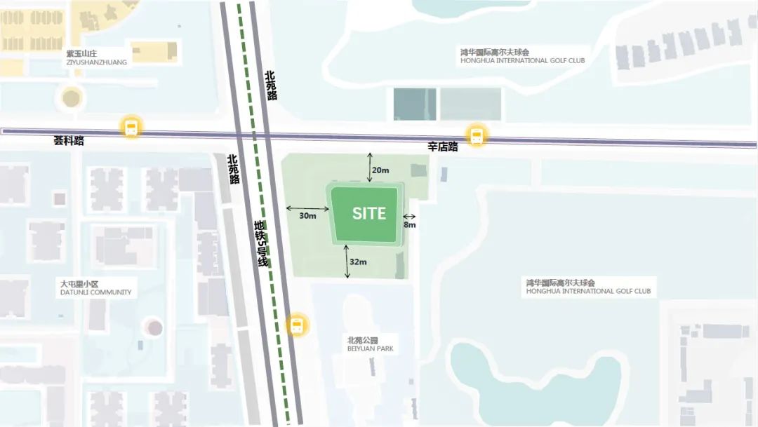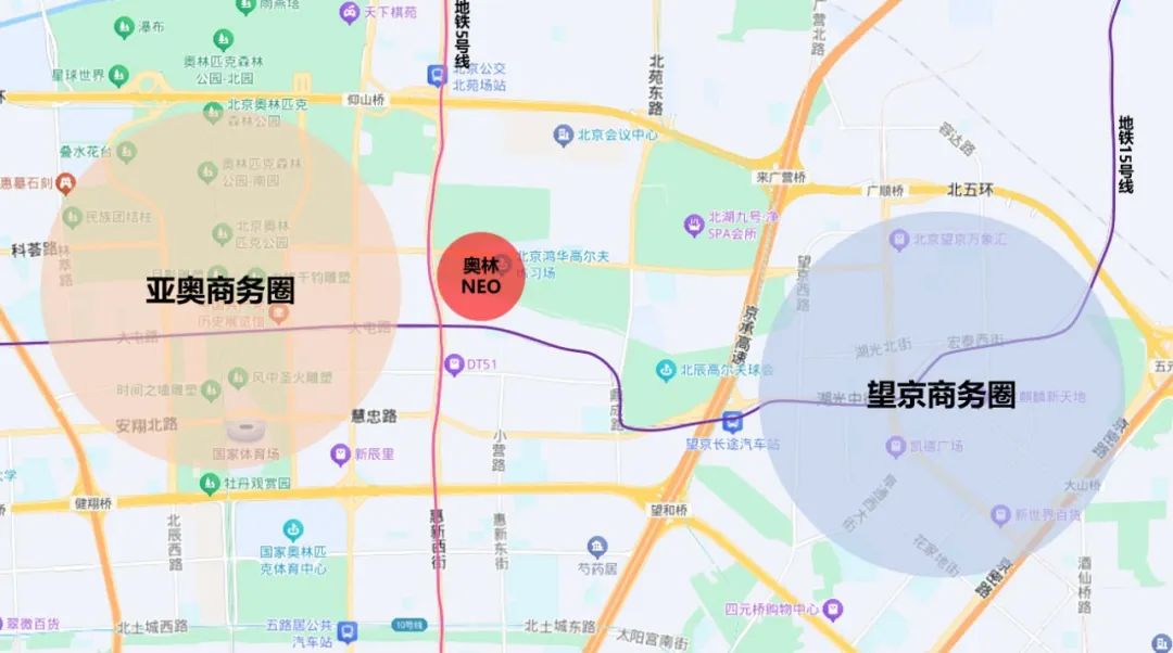 北京奥林NEO项目位于北京市朝阳区,介于四环与五环之间,与5号线、15号线换乘站大屯路东站相邻。场地南侧为公园绿化场地,北侧和东侧为高尔夫训练场地,西侧为居住区,整体自然环境良好,三面环绿。同时坐落于北京市热门商务圈亚奥与望京两大产业聚集地之间的核心地带,周边配套齐全,景观资源丰富。作为两大商务圈的连接点,周边对于高水准办公空间的需求量极大,综合周边市场需求,用地优势,将其全新定位为高科技企业定制的总部独栋办公楼。