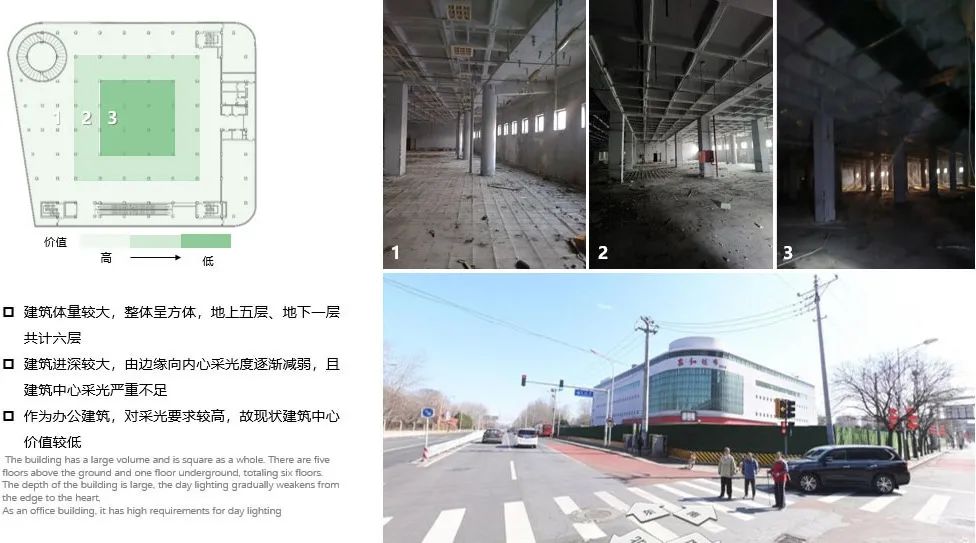 建筑主体改造后作为办公建筑对于采光要求较高。但既有建筑内部进深较大,边缘向内心采光强度逐渐减弱,空间价值越来越低,对于未来入驻的办公人员来说,改造前的建筑平面功能均无法满足日常工作与休闲要求。