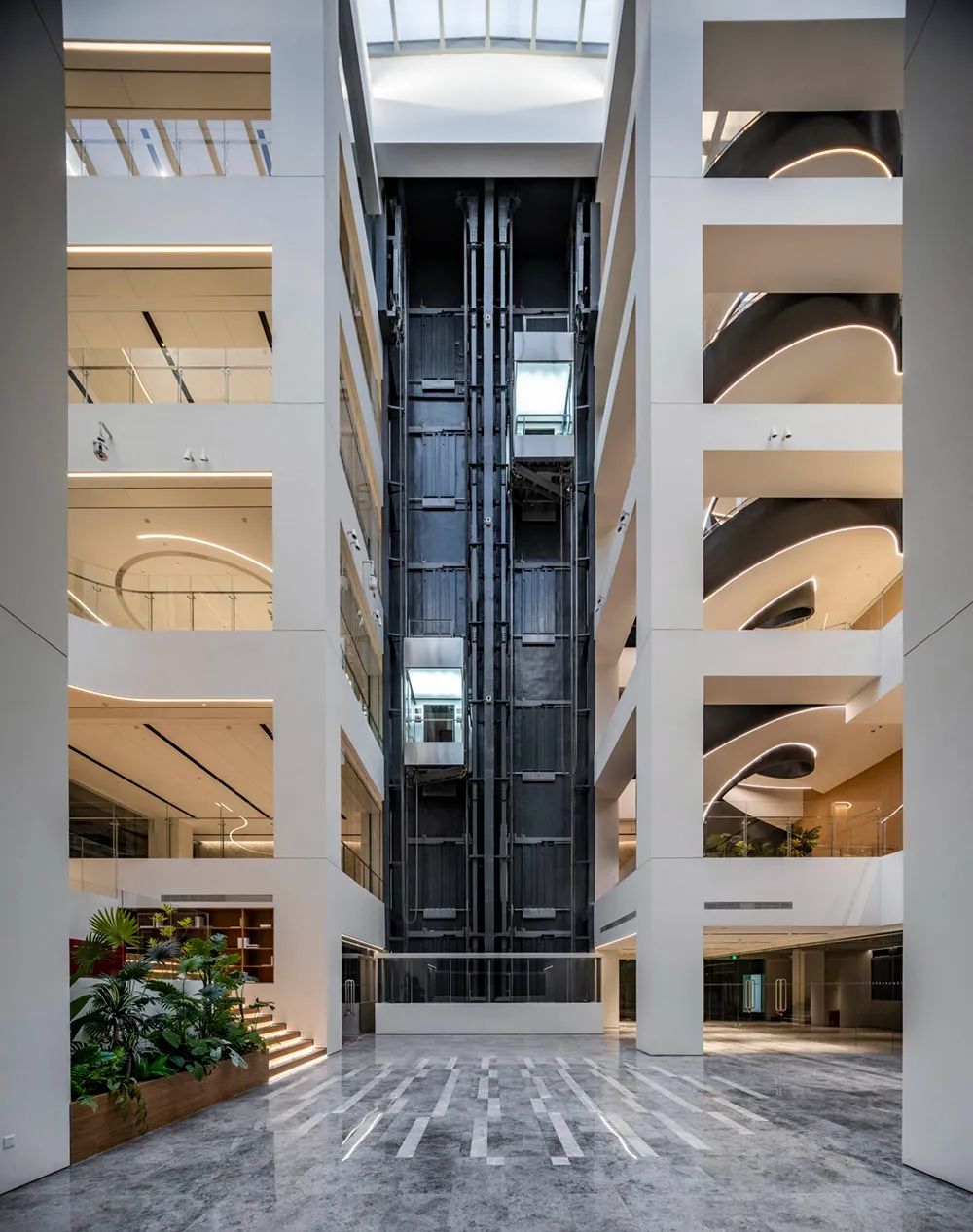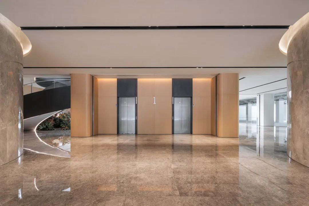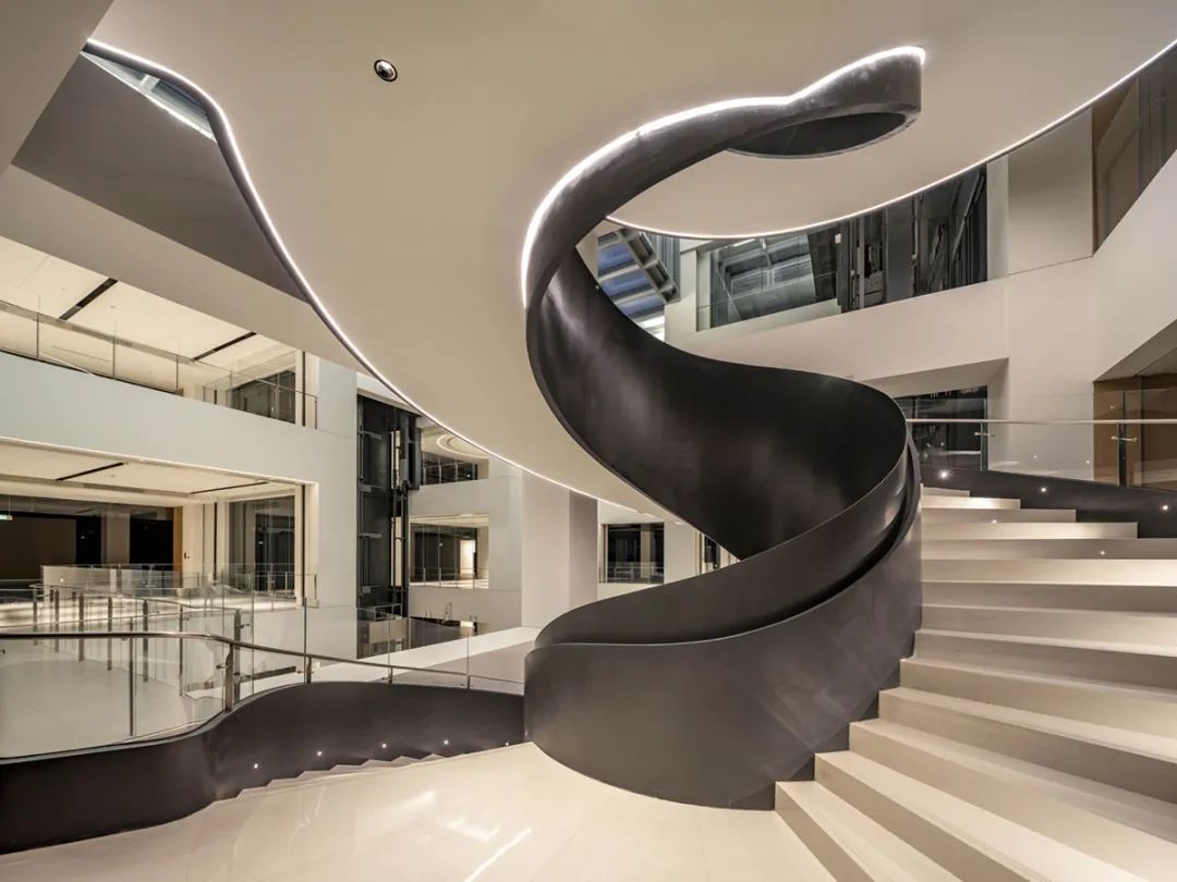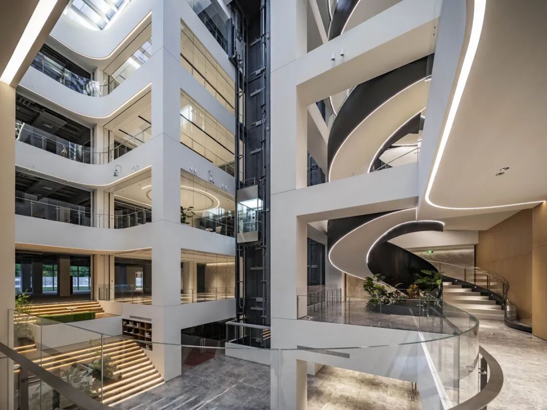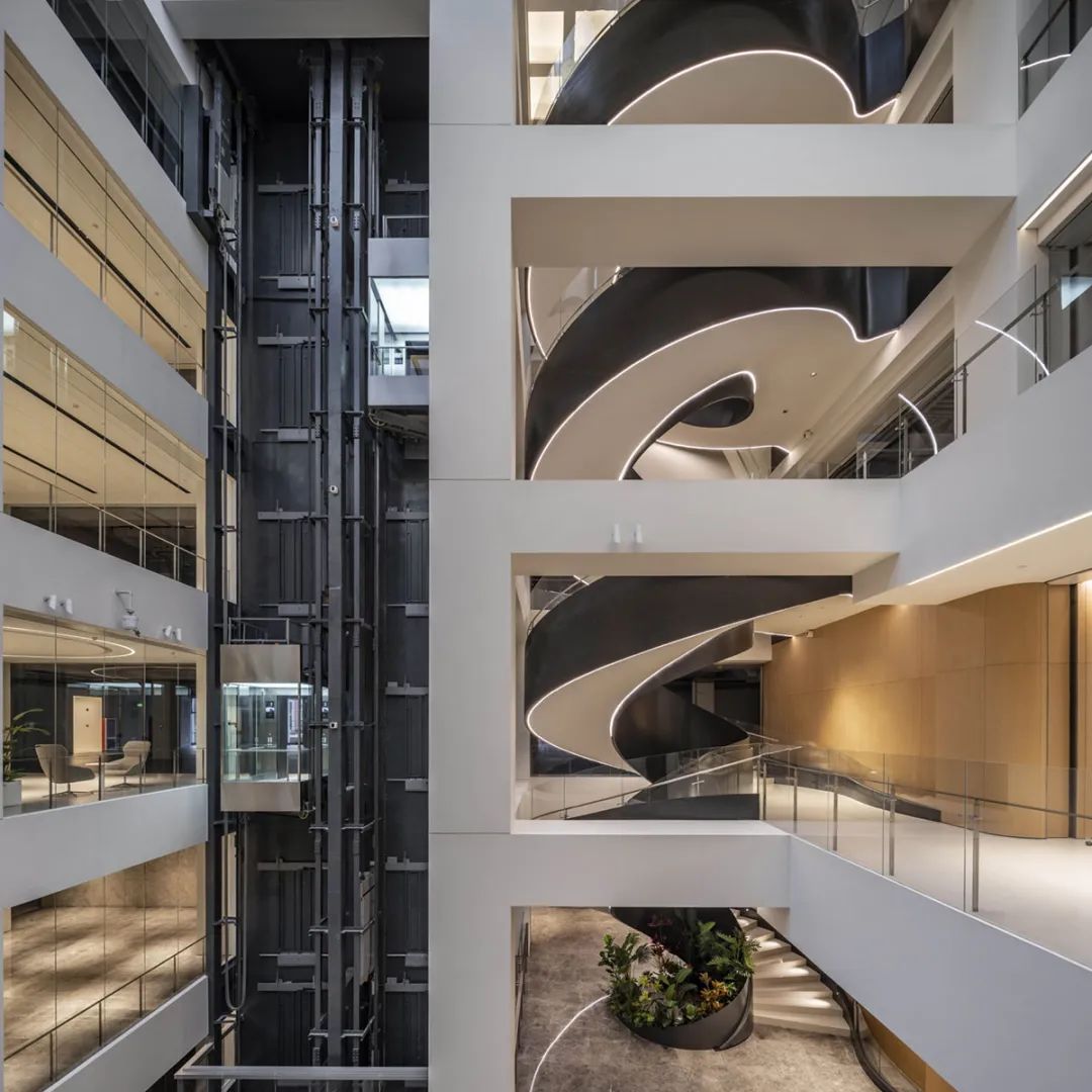 同时由于既有建筑缺少大堂、休闲空间等办公建筑必备的核心区域,故在主要展示面(北侧)及车站临近面(西侧)设置主次入口大堂,兼顾企业形象展示及员工流线的便利性。而特色十字中庭的景观电梯和旋转楼梯构成了建筑的中央枢纽。同时可以围绕艺术楼梯周边举办各种讲演,展览,休闲等日常活动,打造共享交流空间,为舒适的办公环境打下基础。