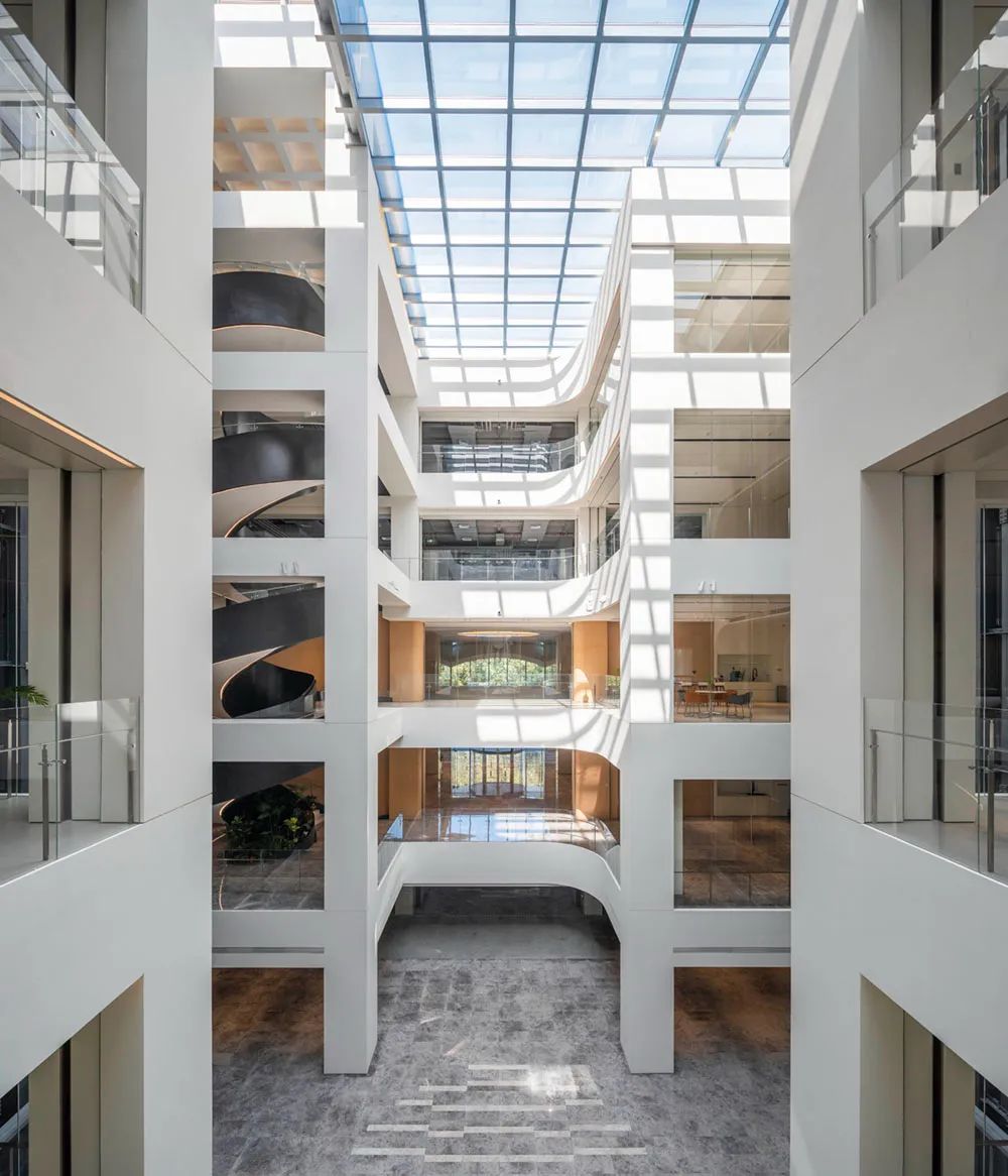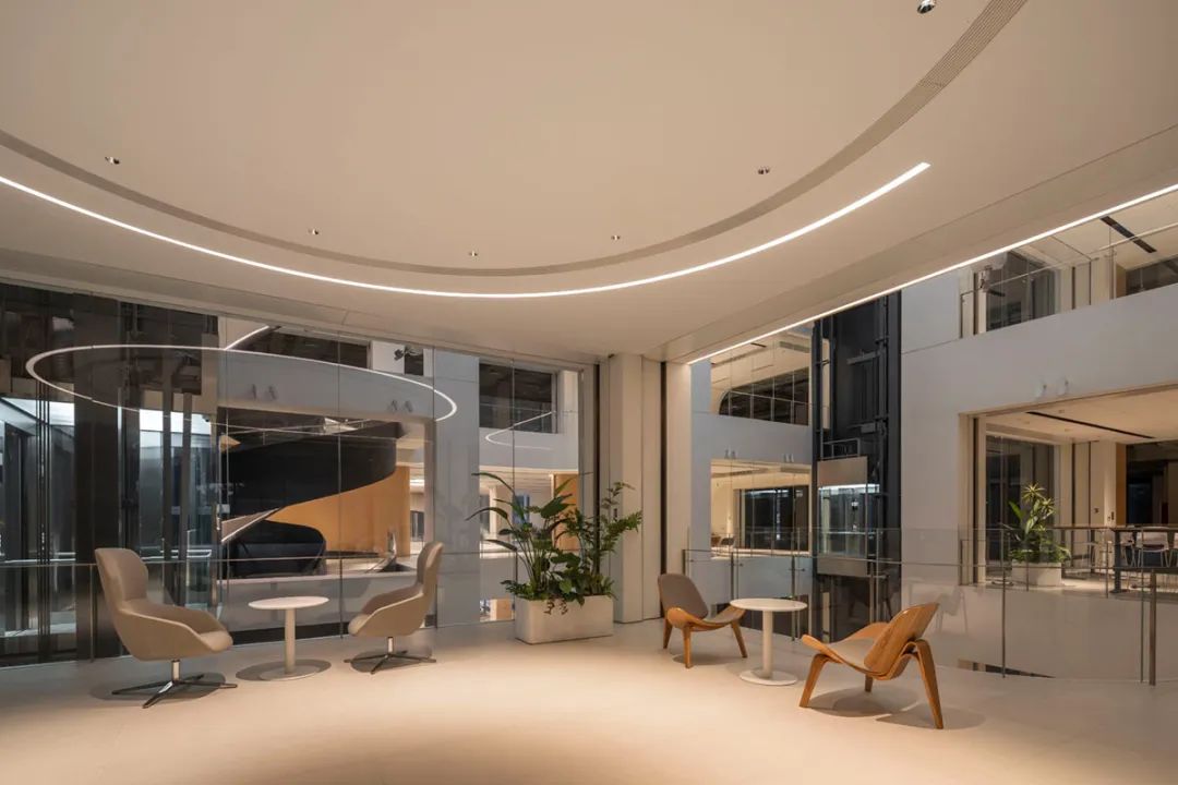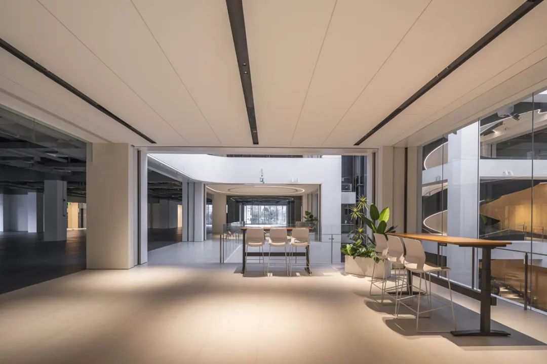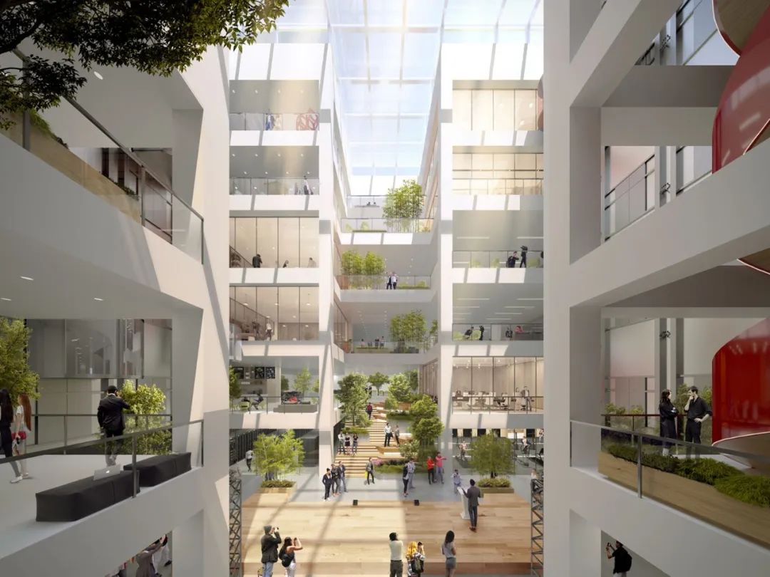 为实现体验式办公,最大限度的利用周边景观资源,打造横跨三层的圆环形露台与总长度约300米的沿线观景露台,引入这些弹性空间,可以丰富员工的日常生活,增加周边空间的社交属性,提供舒适的绿色空间,同时也延续了“沐光绿谷”的设计理念。