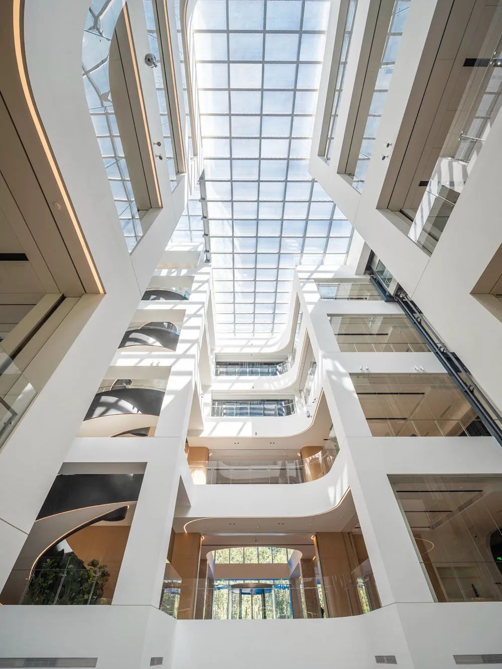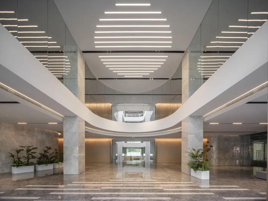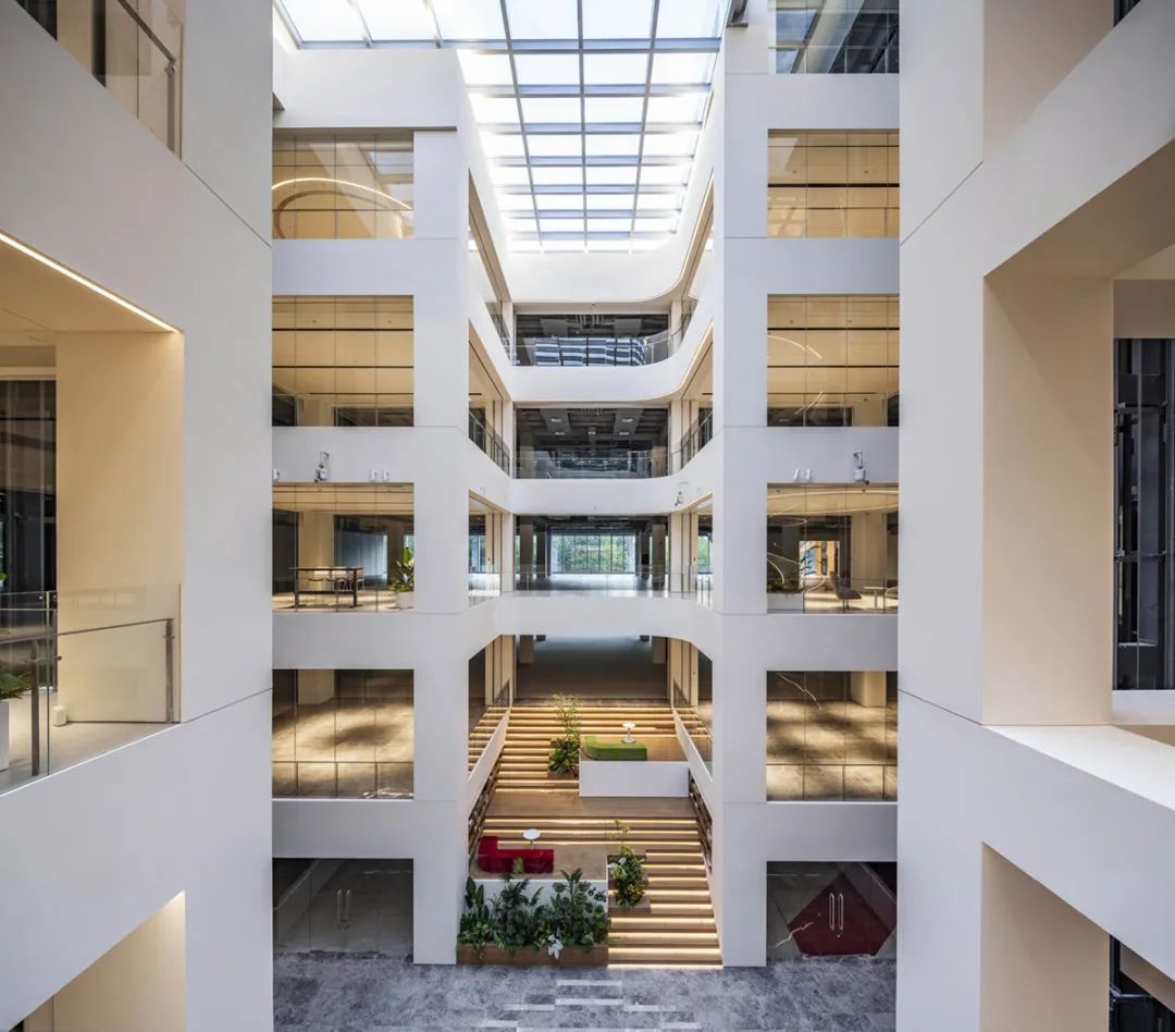 为实现体验式办公,最大限度的利用周边景观资源,打造横跨三层的圆环形露台与总长度约300米的沿线观景露台,引入这些弹性空间,可以丰富员工的日常生活,增加周边空间的社交属性,提供舒适的绿色空间,同时也延续了“沐光绿谷”的设计理念。