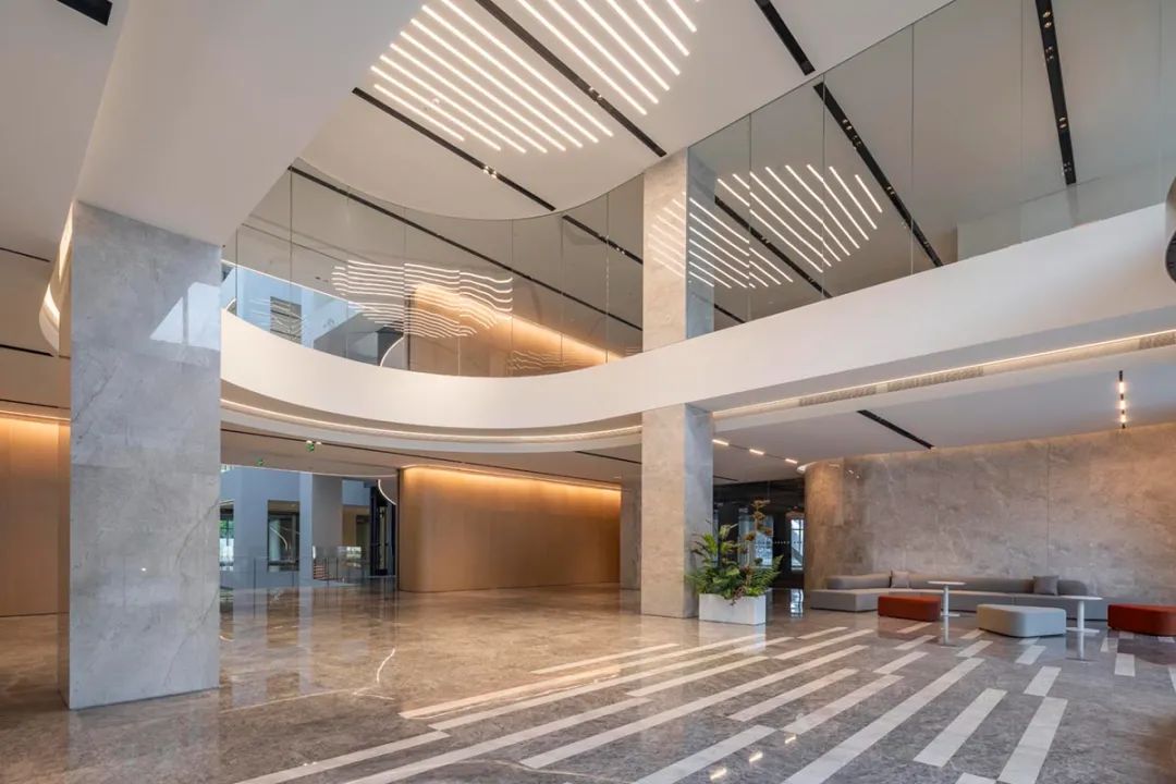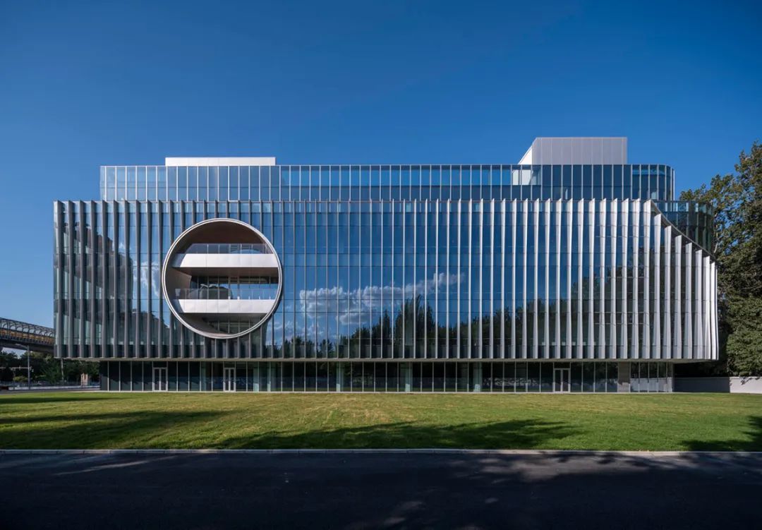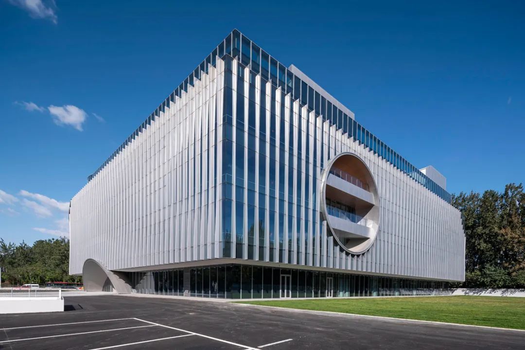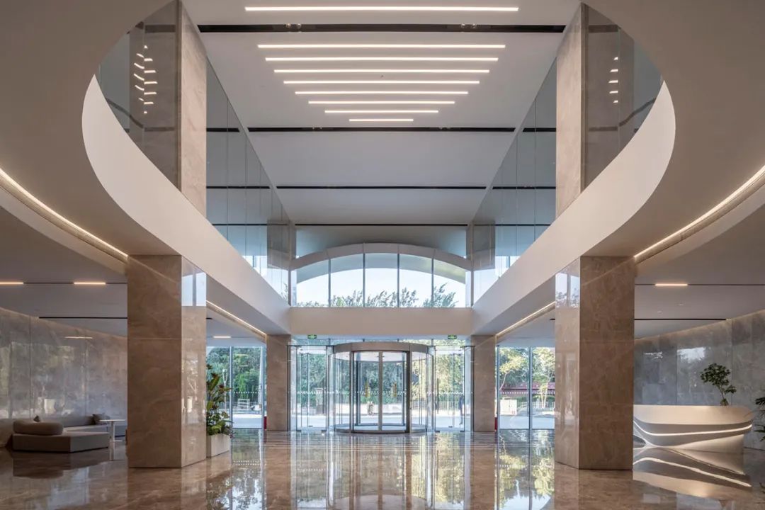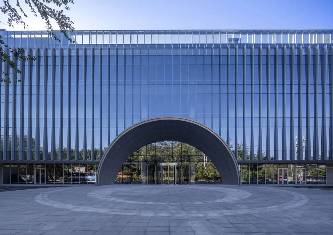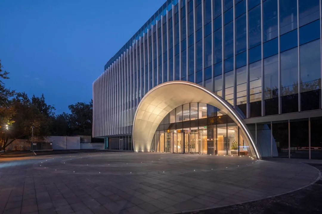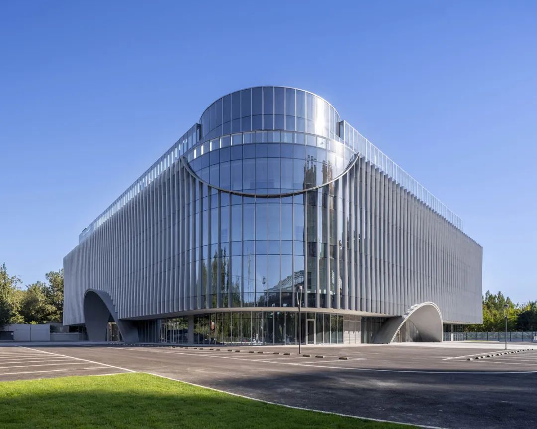 立面材质秉承着简洁的设计策略,以LOW-E玻璃与渐变造型的铝合金型材为主要材料,通过铝合金型材的渐变双曲造型,在室外不同角度可以感受到不同视觉效果,同时可以保障室内采光及私密性。