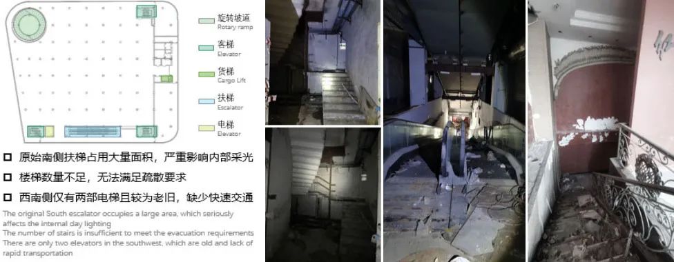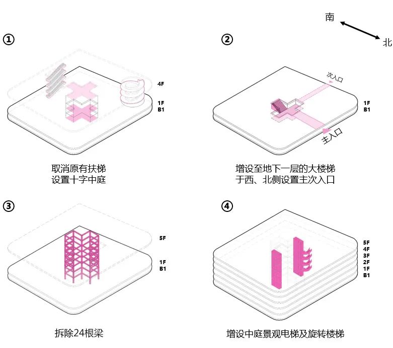 ①首先需要取消南侧扶梯,消除南侧视野屏障,同时引入外部阳光。②北侧与西侧为临街面,受地铁人流到达方向影响,于北、西方向设置主、次入口,同时对应主入口设置通向地下一层的休闲楼梯。③经过结构专业讨论,十字形中庭仅需要拆除24根梁,不需要拆除柱,对整体结构影响较小。④为补充各层之间的立体交通,在中庭两侧设置景观电梯,并补充爆点空间旋转楼梯。