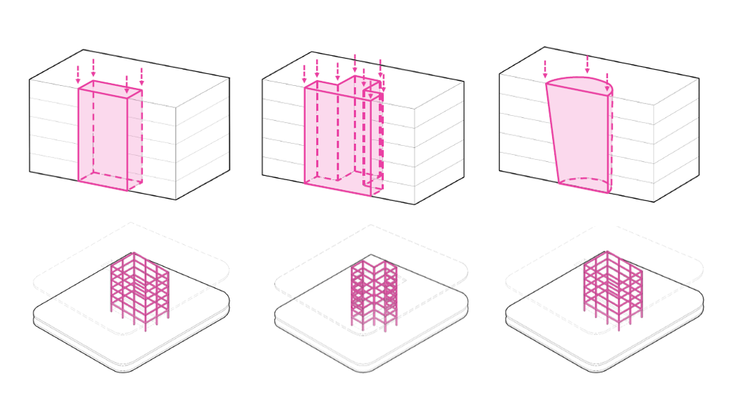 确定了中庭方针之后,中庭的形式成为了下一个需要探讨的话题,我们最终推敲出了三种中庭形式,即“一字形”“十字形”“椭圆形”三种形式,而与既有建筑的相性成为了下一轮选拔的条件,经过对各中庭的可行性进入深入研究后,统计出了各中庭方案对结构的影响,其中“十字形”中庭对结构的影响最小,仅需要拆除20根梁。而对于老旧的既有建筑而言,结构影响需降到最小,最终敲定了对结构影响最小,不需要拆除柱子,仅断掉20根梁的“十字形”中庭。