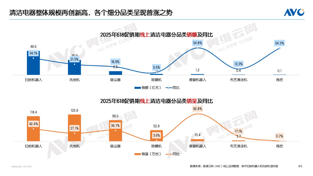 在刚刚过去的“618大促”,持续时间长达6周,可以称得上有史以来“最长618”,与此同时,伴随着国补政策延续,清洁电器行业在这个大促周期交出了一份满意答卷。 本期,小编用6个关键词总结下清洁电器行业。今年618促销期,依然是在“国补”大背景下进行,整体清洁电器维持较高增幅,销额同比27%,但较去年双11而言,增幅明显滑落,一方面,从需求来看,自去年9月底政策实施以来,很多需求在去年提前释放,今年1月份以来,政策不间断衔接,上半年可以说每天都是国补价,另一方面,从补贴力度来看,今年较去年而言,优惠幅度略有下降,以扫地机器人为例,去年很多都是20%,今年统一变成15%,且在促销期间,部分省份出现资金断裂,国补无法进行。我们判断,随着第二轮国补资金陆续到位以及618促销期结束,下半年清洁电器整体将会继续增长,但增速可能会有所回落,不再像上半年如此迅猛,且考虑去年同期4季度高基数,预计今年4季度将会有一定压力,部分时间可能会出现下滑。618促销期间,清洁电器整体均价同比下滑2%,分品类来看,擦窗机器人受头部品牌去年推出性价比产品以来,均价继续延续去年以来的两位数大幅下滑趋势,达到20%,其次是吸尘器,一方面受洗地机冲击影响较大,另一方面,品牌竞争结构变动拉低整体均价,同比下滑15%;扫地机器人终止了长时间的增长,618促销期也开始出现6%下滑;相较而言,洗地机从22年开始下滑以来,连续高速下滑后今年开始收窄,618同比下滑仅有4%;反观除螨仪和拖把,618大促期间同比增长,其中除螨仪在抖音渠道发力期间,均价被快速拉低,而后蔓延到传统电商,目前经历了很长时间持续下滑后,正在经历止跌回升,拖把相较而言在洗地机兴起后被市场逐渐抛弃,体量较小,目前主要是一些多功能的高端蒸汽拖把。消费者在长时间的国补政策下,对产品已经形成锚定价格概念,加之产品迭代快速,市场竞争激烈,因此我们判断,下半年价格仍将会继续下行。奥维云网(AVC)监测数据显示,618促销期,清洁电器领涨家电大盘,同比增长26.0%,生活电器、水家电、厨房小电同比也均超过20%,大家电同比15.2%,整体家电大盘,仅个护家电和厨房大电同比下滑,分别下滑2.1%和12.7%。国补拉动品类渗透率快速提升,我们判断下半年清洁整体增速依旧会位列家电增速前列,尤其是销量增幅可能会更加明显。从增幅来看,擦窗机器人和拖把销额同比增长均超过50%,但拉动动因正好相反,前者属于降价刺激,后者价格拉升。扫地机器人销额40.6亿元,同比增长34.1%,规模稳坐清洁头把交椅,此外,我们注意到扫地机器人销量增幅也是超过销额增长,以往大促都是均价上涨,此轮国补和产品快速迭代下,销量猛涨,确实看到了渗透除的提升。洗地机今年开始强势反弹,品牌格局变化明细那,腰部品牌快速发力。吸尘器继续延续以价换量,销量同比高达36.7%。我们判断,下半年清洁电器整体规模格局依然会维持以扫地机器人和洗地机为主,且增幅同样可观,其他细分品类借助以价换量、新渠道发力、细分市场发力等,从增幅来看均有机会突围出来。618促销期各个清洁细分品类高增长的同时,得益于各个细分功能形态的产品拉动,从数据层面来看,有三个细分增长十分显著,洗地机器人形态自去年头部品牌推出以来,得到了市场认可,618促销期销额达到12.7亿元,同比增长2494%;基站集尘吸尘器品牌数量较去年同期翻了一番,除戴森外,其余各头部品牌均有涉足,销额同比增长224%;尽管擦窗机器人整体均价下行,性价比单机款产品销量暴涨,但高客单的基站擦窗机器人销额同比增长也达到了653%。我们判断,这几个细分赛道在下半年仍然会保持高涨,但均价一定会开始大幅下滑。从GMV数据来看清洁电器增幅明显,但实际剔除掉退款后,可能实际增长仅有个位数,我们了解到,多数企业退款率高达四、五十,而且很多消费者还没有收获商品,待收货后,又有一波退货。极高的退款退货率不仅让行业带来虚假繁荣,还给企业造成更多经营成本,让行业卷上加卷。我们寄希望于扫地机和洗地机脱去网红属性的外衣,退款退货率能够回归正常,但短期来看,我们判断退款退货率仍然会保持在较高“水”位。了解更多清洁电器市场