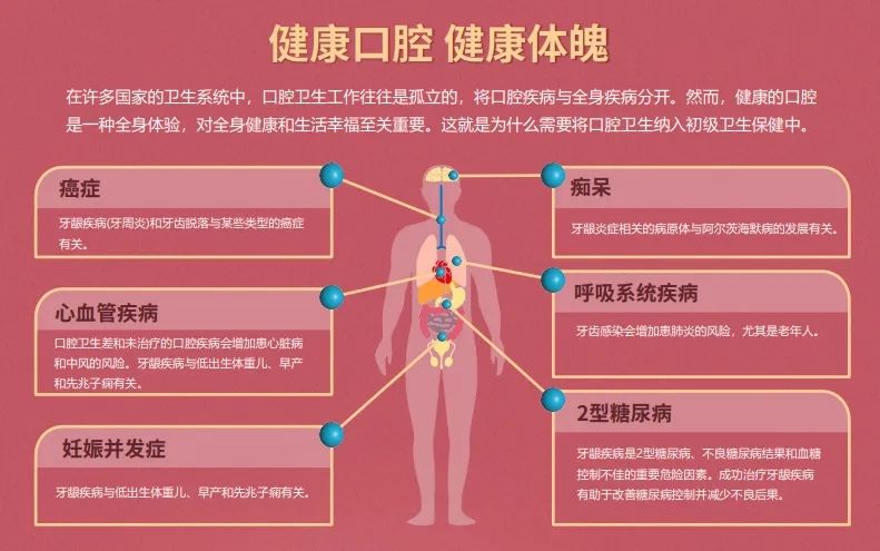 口腔疾病不仅影响口腔咀嚼、发音等生理功能,还与脑卒中、心脏病、糖尿病、消化系统疾病等全身疾病有密切关系。