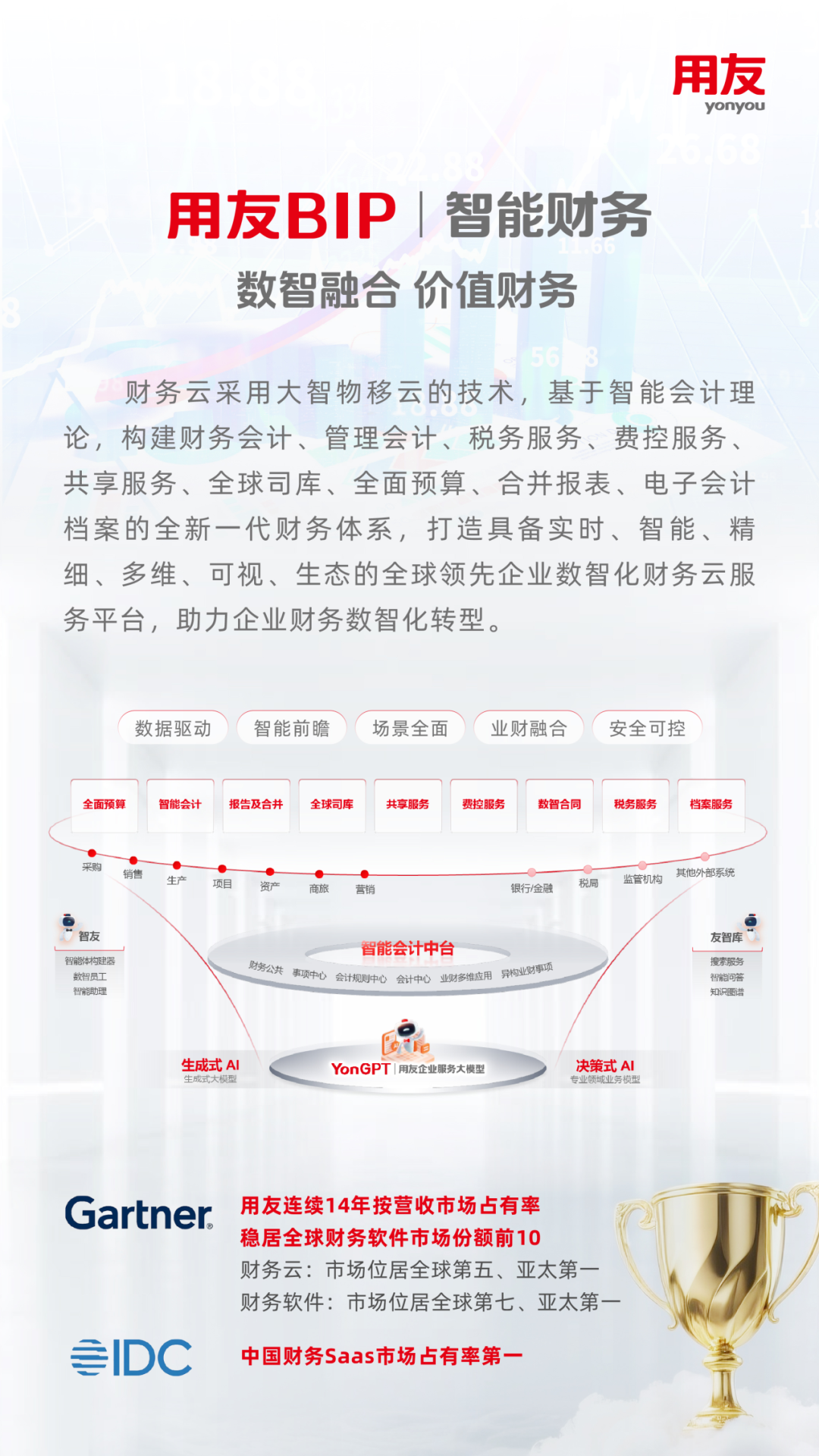 2025年,用友BIP智能财务持续秉承“数智融合 价值财务”的价值主张,积极落实产品与国产大模型的强强联合与深度融合创新,基于用友BIP企业AI推出更加丰富的财务数智化创新解决方案,通过财务共享、智能会计、企业绩效、费控服务、电子档案、全球司库、税务云、合同云等产品的无缝连接,助力大型企业构建业财税金档一体化财务管理体系,并以更加成熟完善的财务数智化系统,助力更多企业突破发展瓶颈,实现能力进阶、价值升维。