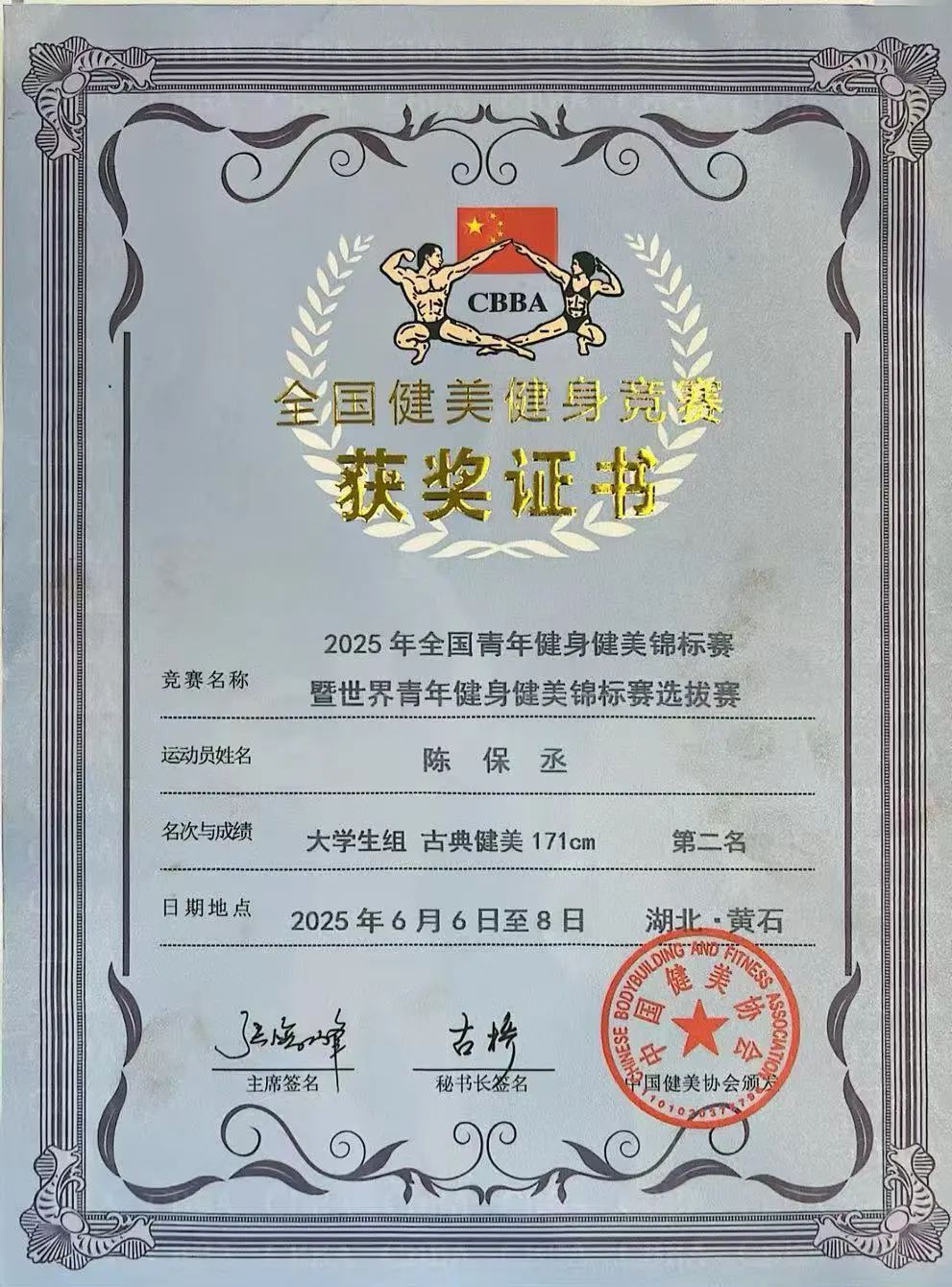 2025年6月5日至9日由中国健美协会、黄石市人民政府主办,湖北省社会体育管理中心、黄石市体育事业发展中心承办,湖北省健身健美运动协会、黄石市健美协会协办的2025年全国青年健身健美锦标赛暨世界青年健身健美锦标赛选拔赛在湖北省黄石市举行,此次比赛共吸引了超过800名健美爱好者参赛,参赛人次超过1000人次,我校数科国际221班陈保丞同学和视传233董铠宁同学前往参加了古典健美和健体两个项目的比赛。