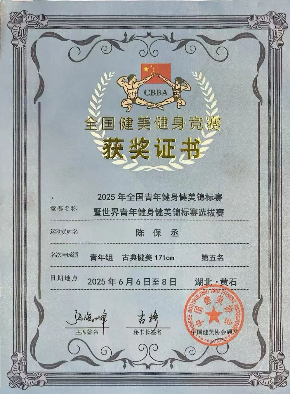 北金科运动健儿满怀激情、斗志昂扬,全身心投入到每一场比赛中,通过两天艰苦的比赛和评委会严格评审,最终陈保丞同学获得2025年全国青年健身健美锦标赛青年组古典健美171CM组第五名、大学生组古典健美171CM组第二名的好成绩。