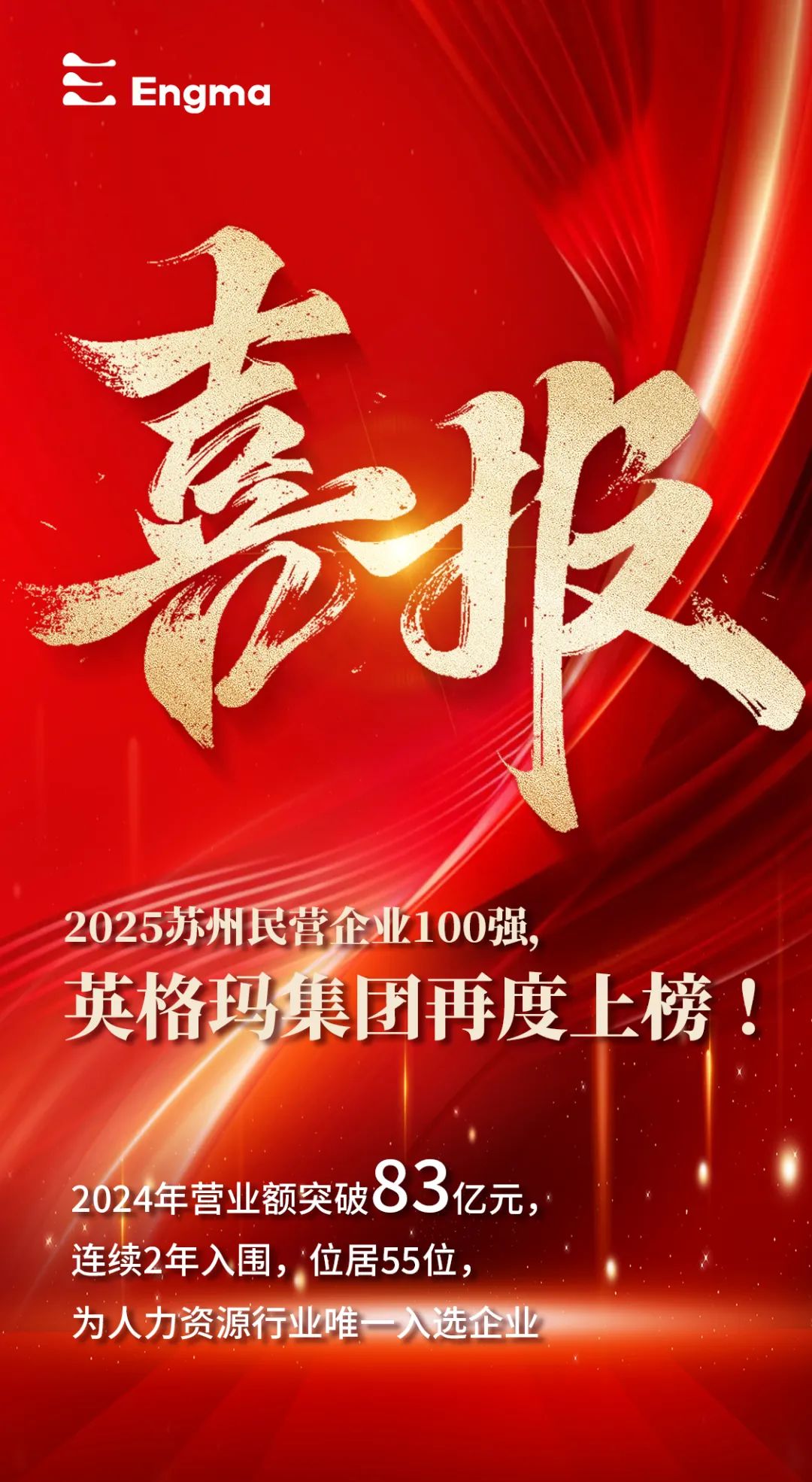 7月21日,苏州市工商联正式发布“2025苏州民营企业100强”榜单,苏州英格玛服务外包股份有限公司再度入围,位列第55位,成为榜单中唯一一家人力资源服务企业。