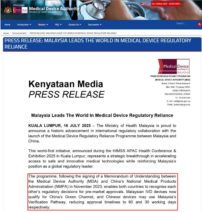 在国内医械产业高度内卷,械企奋力出海的当下,一则来自马来西亚的消息让业内同道倍感振奋:2025年7月16日,马来西亚医疗器械管理局(MDA)发布重要公告:自7月30日起,正式启动与中国国家药品监督管理局(NMPA)的医疗器械监管互认计划。这不仅是两国监管合作的飞跃,更是中国创新医疗器械企业进军东南亚市场的黄金机遇!