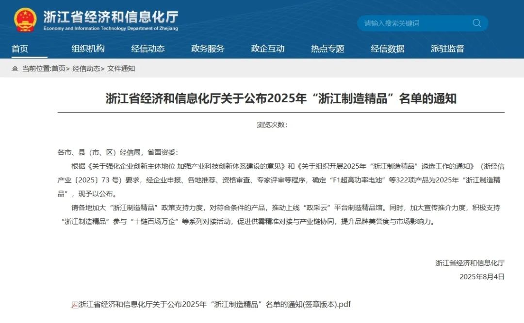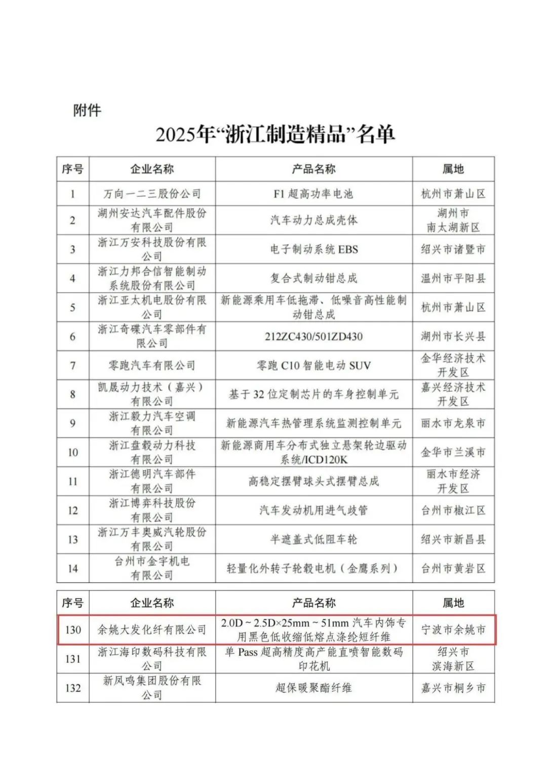 8月4日,浙江省经济和信息化厅公示了 2025 年度 “浙江制造精品”名单。公司自主研发的 “2.0D~2.5D×25mm~51mm 汽车内饰专用黑色低收缩低熔点涤纶短纤维产品”入选。该产品具备“低收缩+低熔点”两大协同优化特性,在技术创新与实际应用中具有突出价值。