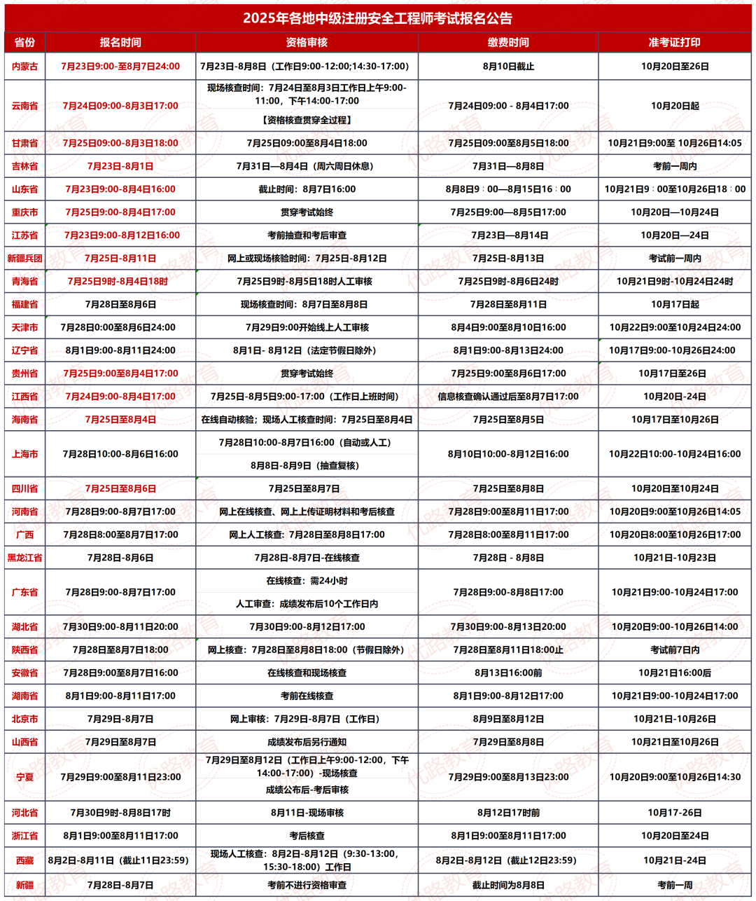 32地2025中级注册安全工程师职业资格考试报名通知已出,13地报名中!