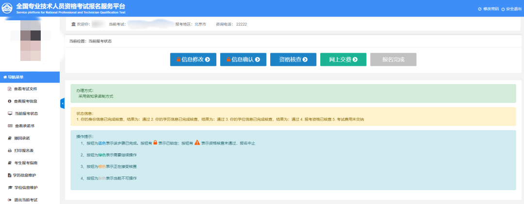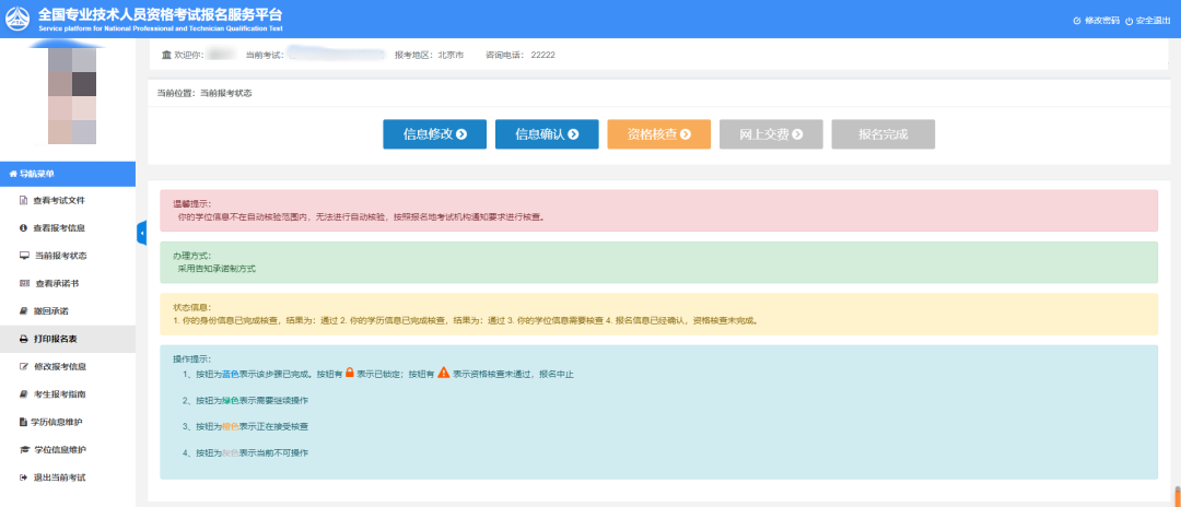 经核查,符合报考条件的报考人员再次登录网站查看报考状态,如状态显示核查通过,报考人员即可按规定时间缴纳考试费用。
