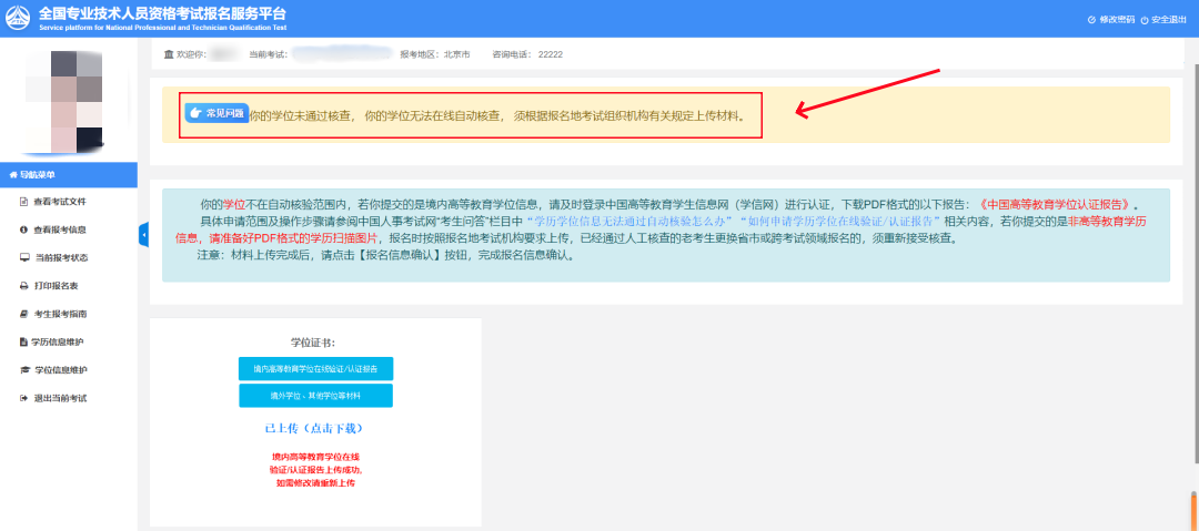 报考人员提交的境内高等教育学历学位信息无法通过在线自动核验,可根据报名网站弹窗提醒内容,前往中国高等教育学生信息网(学信网)进行验证/认证,申请下载所需的学历学位在线验证/认证报告,按报名地考试机构要求上传并接受人工核查。