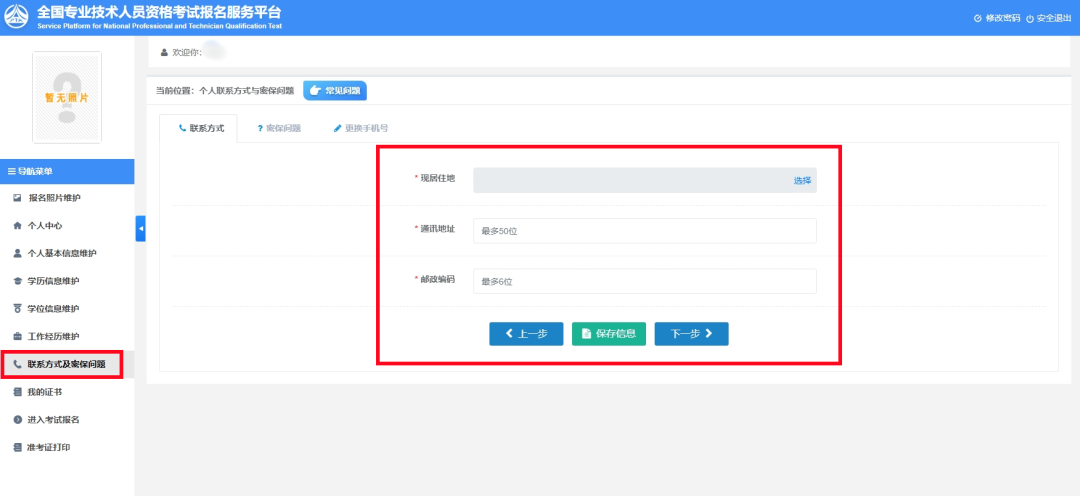 报考人员需要填写:现居住地、通讯地址、邮政编码