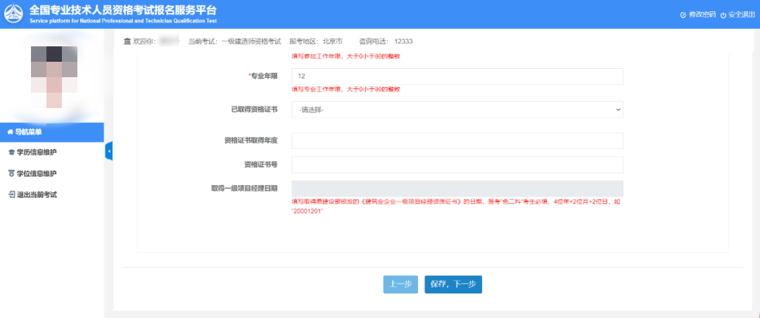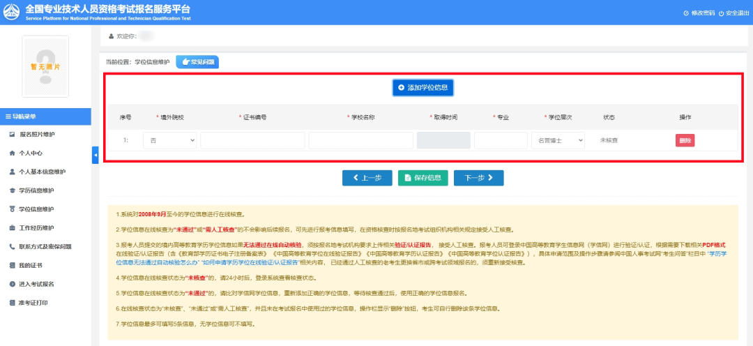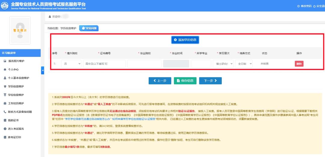 注意:如果学历认证没有完成或者还在审核中则没法选择,也没有信息。学历信息无需全部填满,只需填写用于报名条件的学历、专业即可。例如,本科满足条件,无需填写学位信息以及后续的研究生、博士等非工程经济类学历,避免系统审核不成,需现场核验的情况。